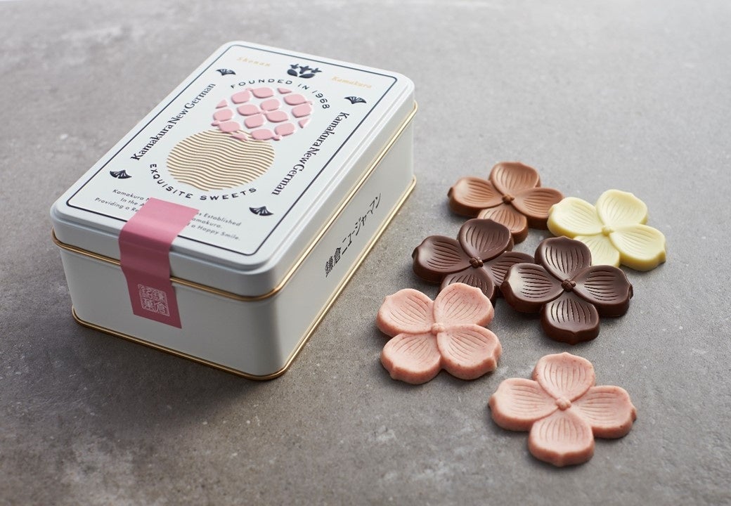 サクサクとした食感であじさいの形に焼き上げたかまくらボーロと、あじさいをモチーフにしたなめらかな2種類のプレーンチョコレートを詰め合わせました。