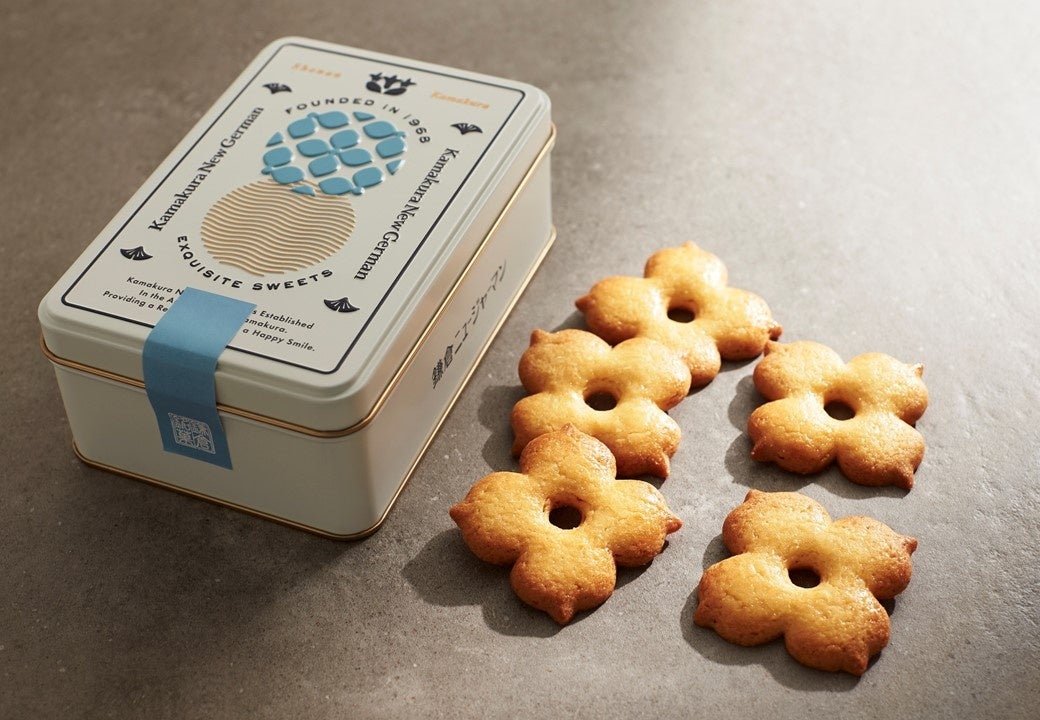 あじさいの形に焼き上げたかまくらボーロを、鎌倉の風物をちりばめた特別な缶に詰め合わせました。