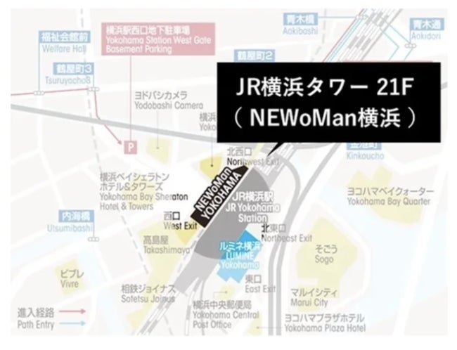 JR横浜駅 中央改札または中央南改札からすぐ駅直結のアクセスとなります。NEWoMan横浜12Fにて乗り継ぎ、21F迄お越しください。