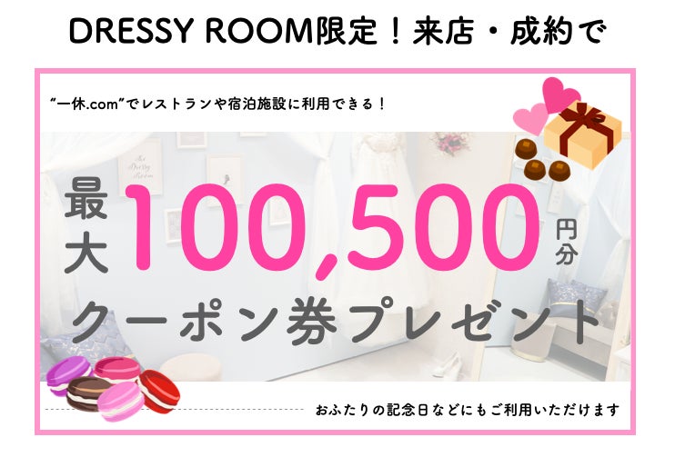 PLACOLE & DRESSYSNS総フォロワー数85万人突破記念として、最大100,500円分に増額しプレミアムクーポンをプレゼントいたします。レストランやホテルの宿泊でご利用いただけるクーポンはこれからの結婚式準備の束の間のひとときに癒しとステキな時間を過ごしていただきたいと思い、ご用意いたしました。おふたりの記念日などにもご利用いただけます。DRESSY ROOM来店後、プラコレウェディングの認定会場1100以上の全国の結婚式場のブライダルフェアの予約・成約をするともらえる最大100,500円のクーポン。賢くオトクに結婚式場探しをしせんか?