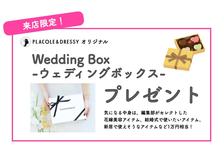 先着限定15組のプレ花嫁様へ、1万円相当のアイテムが入ったウェディングボックスをプレゼント。結婚式当日までの間、花嫁さまの結婚式準備を楽しく、ワクワクしたものになるように、花嫁様がちょっとでも、幸せを感じていただけるようをウェディングボックス作りました。箱をもらった瞬間、あけた瞬間、そして使うときもワクワクするそんな素敵な贈り物を花嫁に。