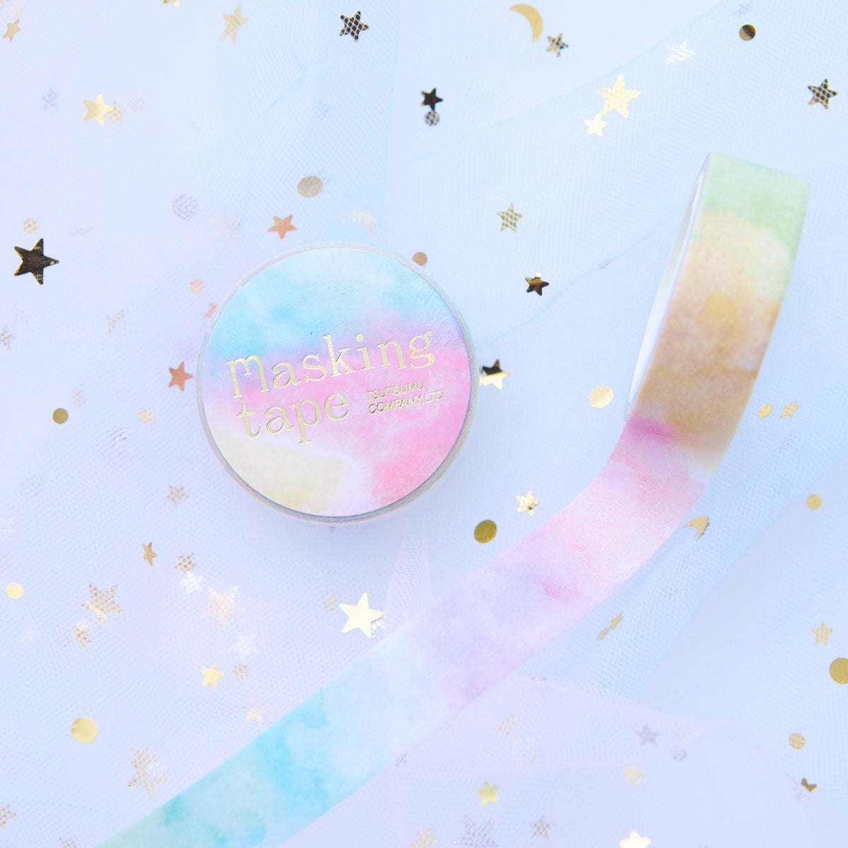 包む「マスキングテープ キラキラ パステルレインボー グリッターグラデ」は、パステルカラーのグラデーションとグリッター加工が施され、和紙素材ならではの質感が楽しめるマスキングテープです。