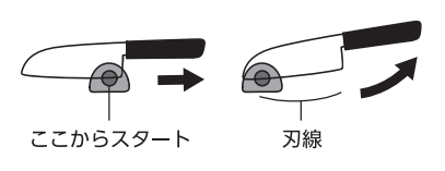 ②包丁の刃の形 (刃線)に沿って、ハンドルを傾けながら、軽い力でまっすぐ手前方向に引きます。