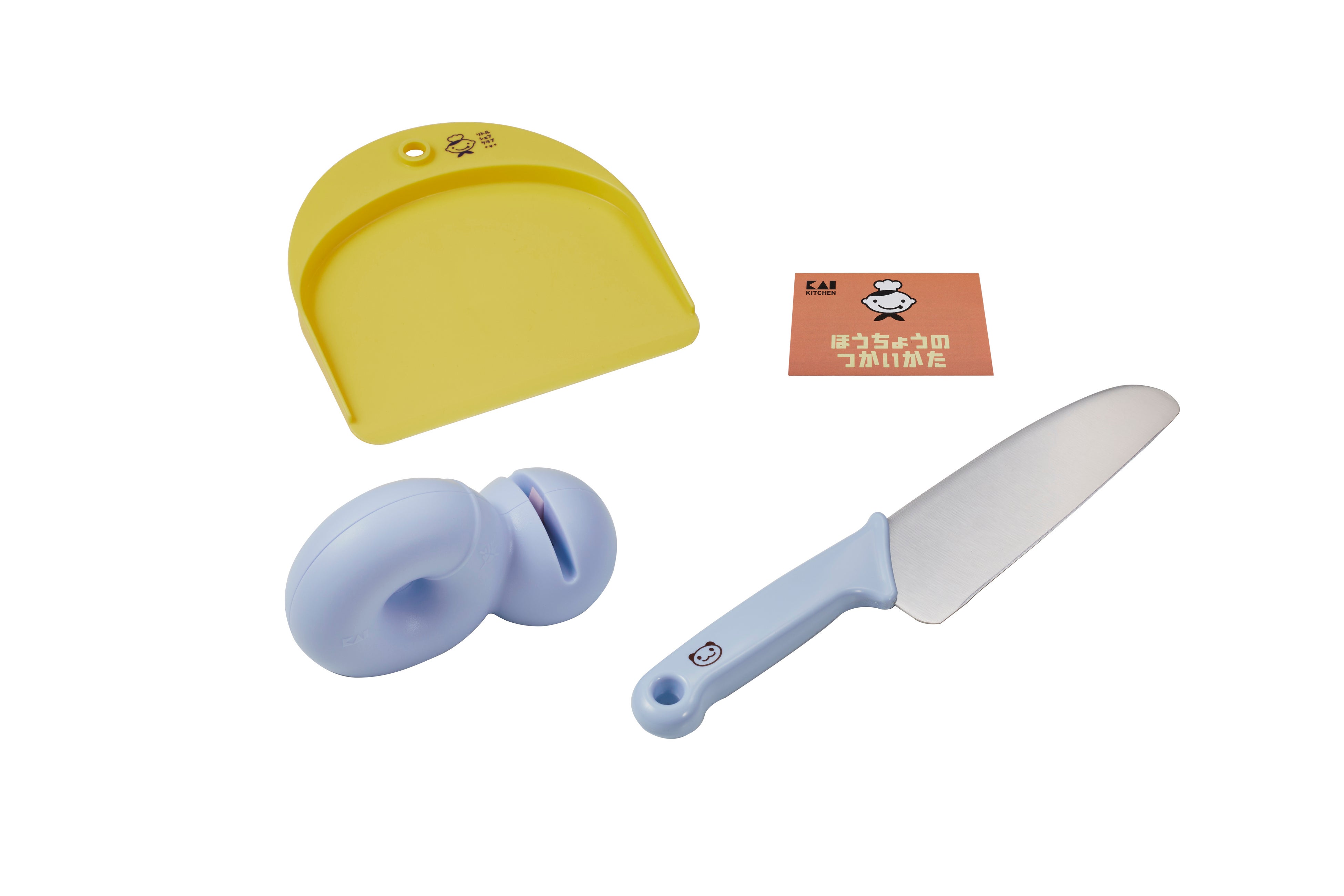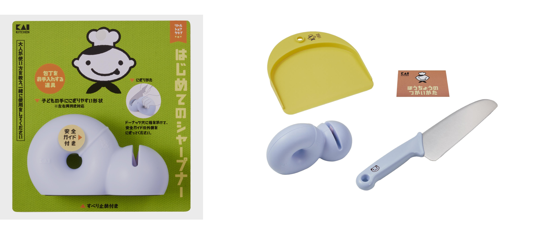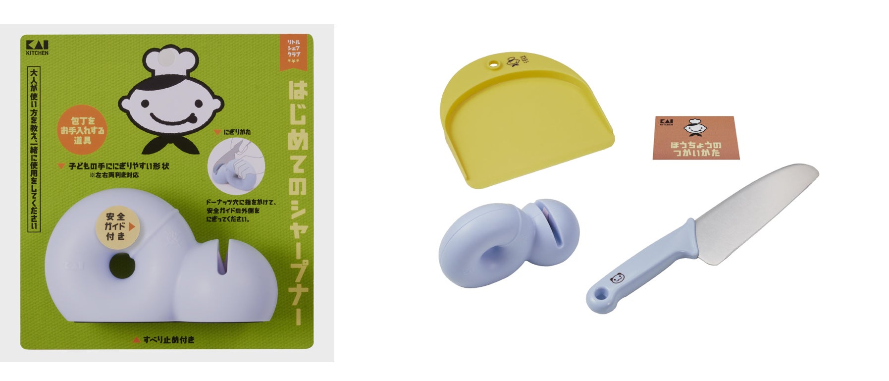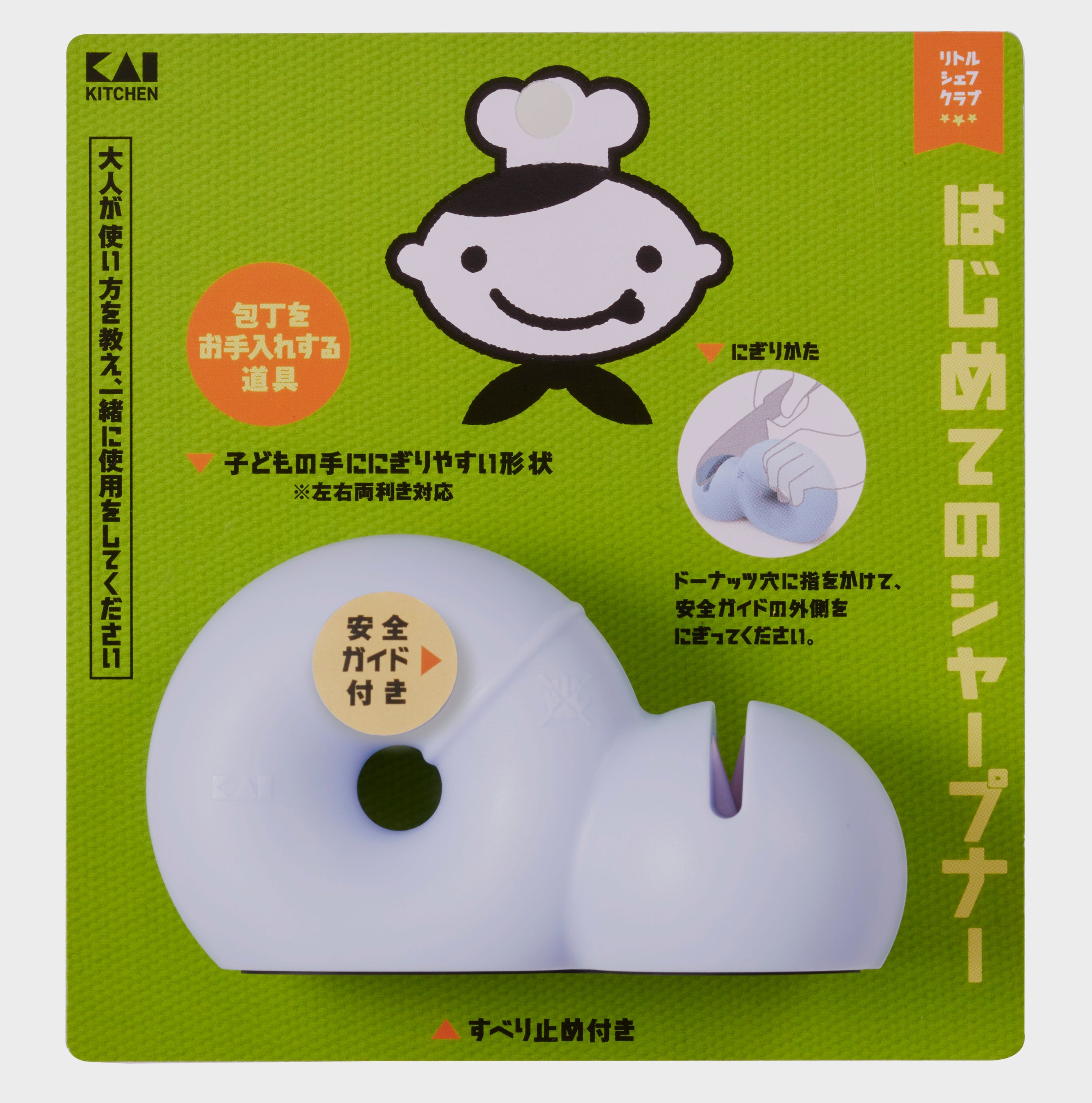 今回登場するシャープナーは、ドーナツ型の持ち手が小さな子どもの手でもにぎりやすい※子ども向けのシャープナー。リトルシェフクラブの本格刃付け包丁と一緒にお使いいただけます。「包丁は研ぎながら長く使う」という習慣や道具に対する愛着心を持ってもらうため、新しくラインナップに加わりました。にぎる場所を示した安全ガイド付き。包丁の切れ味を維持し、長く使うためのお手入れ道具としてご提案します。切れ味のよい包丁を使うことは安全性(けがをしにくい)にもつながり、料理をすることが楽しくなります。貝印は、今後も皆様の調理シーンを楽しく豊かにするアイテムをお届けし、充実したキッチンライフを提供してまいります。 ※意匠登録第1748130号