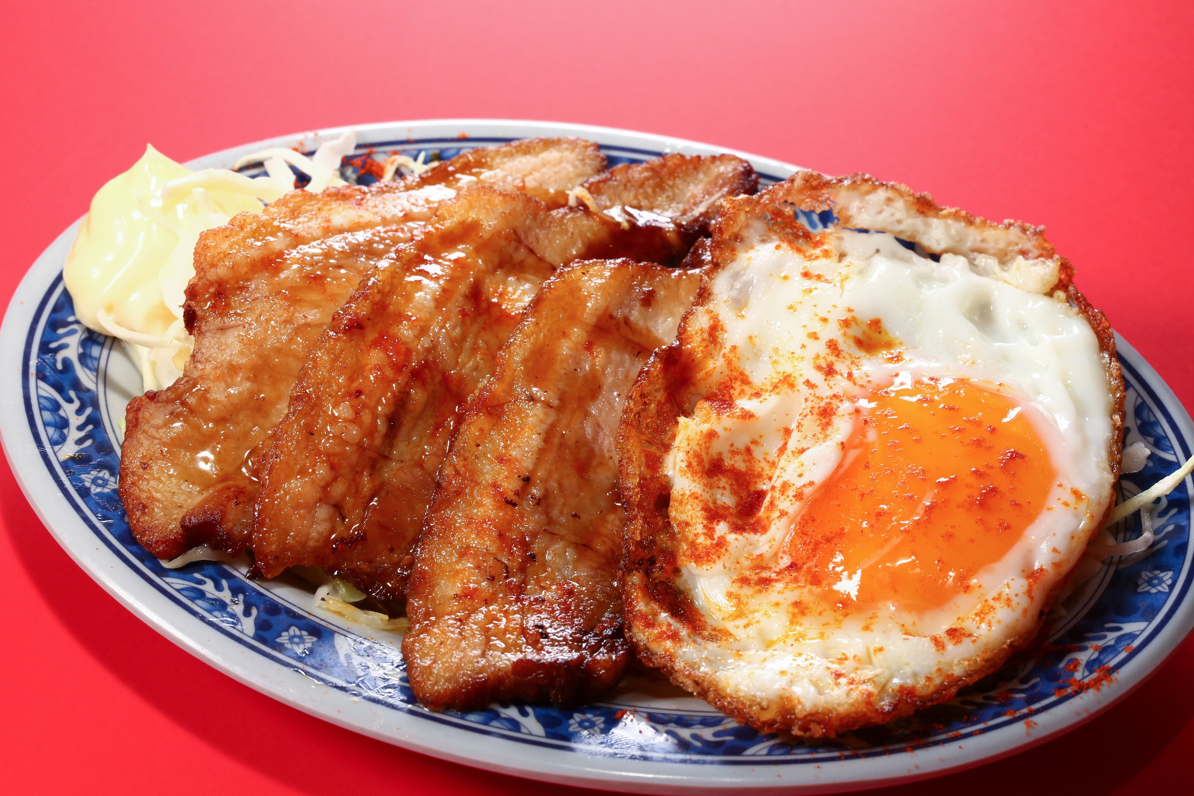 有楽町次次限定商品。料理長秘伝の煮汁にじっくり漬け込み焼いたチャーシューと目玉焼きの絶妙な組み合わせ!
