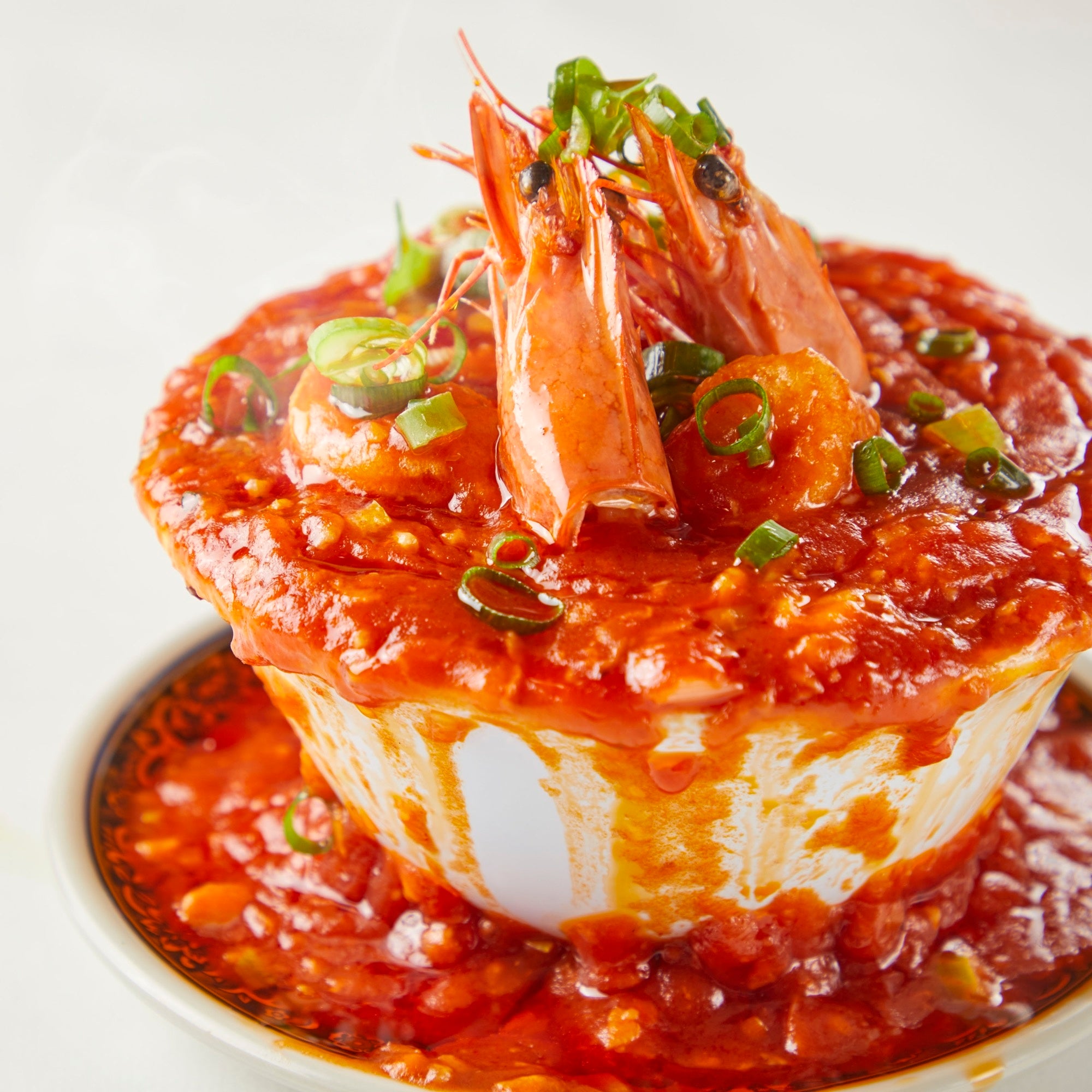 大人気の看板商品、こぼれエビのチリソース。海老が増量となり、旨味と辛味をさらに美味しくリニューアルしました。