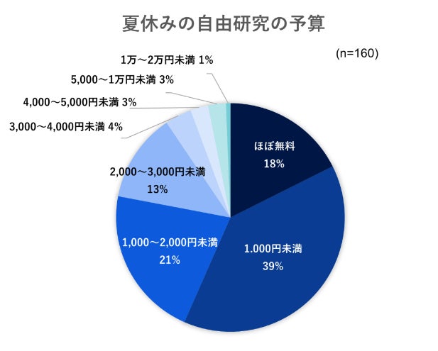最も多かったのは、「1000円未満」で39%。つぎに、「1000~2000円未満」が21%でした。「ほぼ無料」という回答も18%で、自由研究にかける予算は低めで、お金をあまりかけずに取り組もうとする姿勢が多く見られます。
