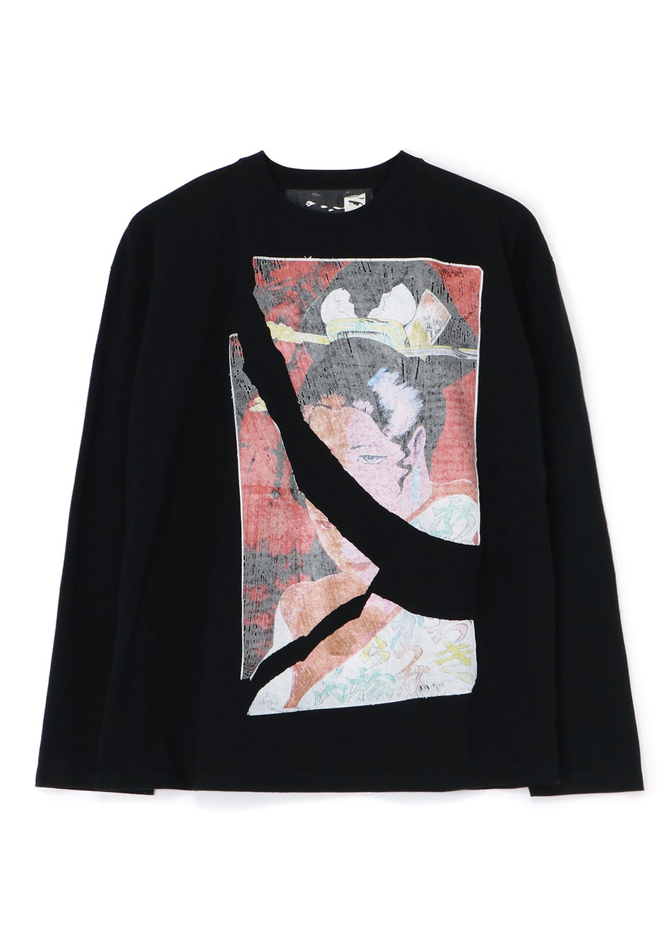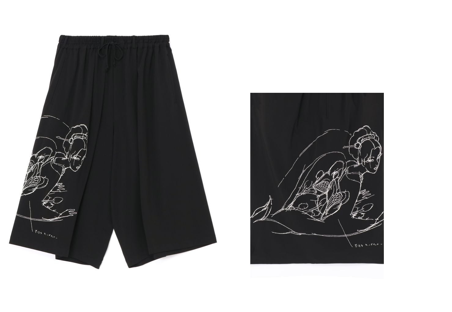 腕に天翔ける龍の刺青をし、小太刀を持つ艶やかな女性の絵をあえてモノクロプリントにすることで、女性の持つ鋭い空気感を表現したレイヤードパンツ。長袖Tシャツとシルクネクタイはフルカラーにすることで、絵本来のもつ艶やかさと力強さを浮かび上がらせる。