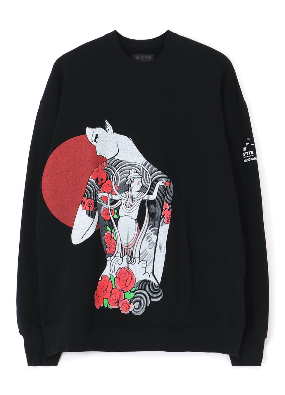 “劇画史に一時代を画した”と評される「同棲時代」は、映画・ドラマ化と共に社会現象となった作品。未来が曖昧な男女のささやかで不確かな幸せがやがて崩壊をしていく様を、美しく文学的なモノローグと、息をのむほど劇的で美しいシーンを次々と眼に飛び込むグラフィカルなコマ割りで表現する。2011年に発売された上村一夫氏の大図鑑「リリシズム」表紙として有名な主人公・飛鳥今日子の花と涙は、叙情あふれ感傷的女性美を確立。フーディー、トートバッグ、ネクタイにプリント。また、フーディーの背景にはマゼンダを加えることで、花の涙をより儚く、美しく魅了させる。腕には、S’YTE ×Kazuo KamimuraのWネームを配した。