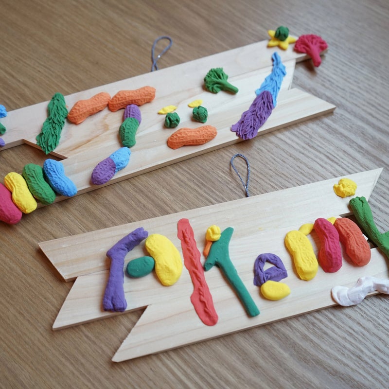 →葉っぱや木の実など自然のかたちをそっくりそのまま写せるシリコン型をつくり、カラフルな粘土でオリジナリティあふれるネームプレートを作ります。