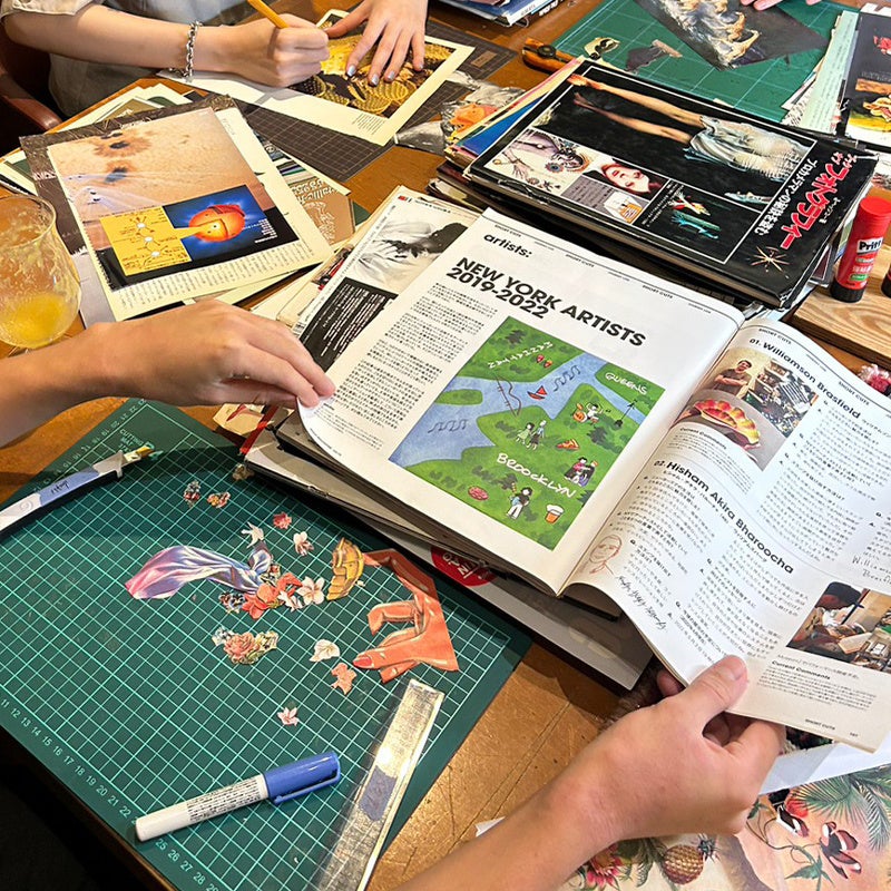 →古本をめくって好きなページを見つけて、切って、貼って自分の好きな世界を作り出すコラージュアートで、オリジナルキーホルダーを作るワークショップです。 アーティストが古本屋で集めた数々の本をご用意、綺麗に切ったりちぎったり自由に作って遊びましょう。