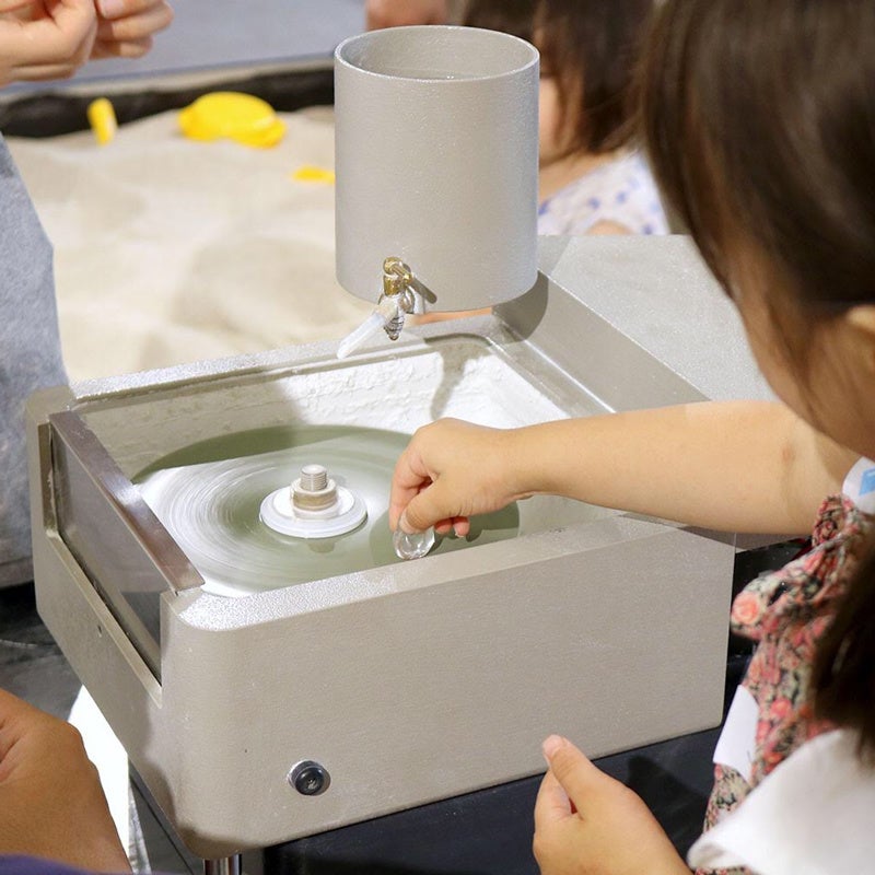 →鉱山に見立てた砂場から、商品の制作過程で割れてしまった本物の宝石の原石を探して、伝統工芸士の指導のもと一緒に研磨し、職人がネックレスのチャームに仕立てその日にお持ち帰りいただけます。