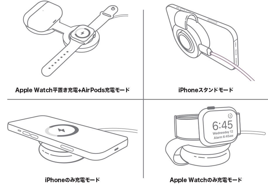 iPhoneスタンドバイモードでの iPhoneディスプレイスタンドとして充電、またApple WatchナイトスタンドモードでApple Watch充電スタンドに。旅行宿泊先のホテルで、番組をストリーミングしたり、ビデオチャットに参加したり、多彩なスタンド機能で充電しながら使用出来るので、外出時でのデバイスの利便性がさらに高まります。