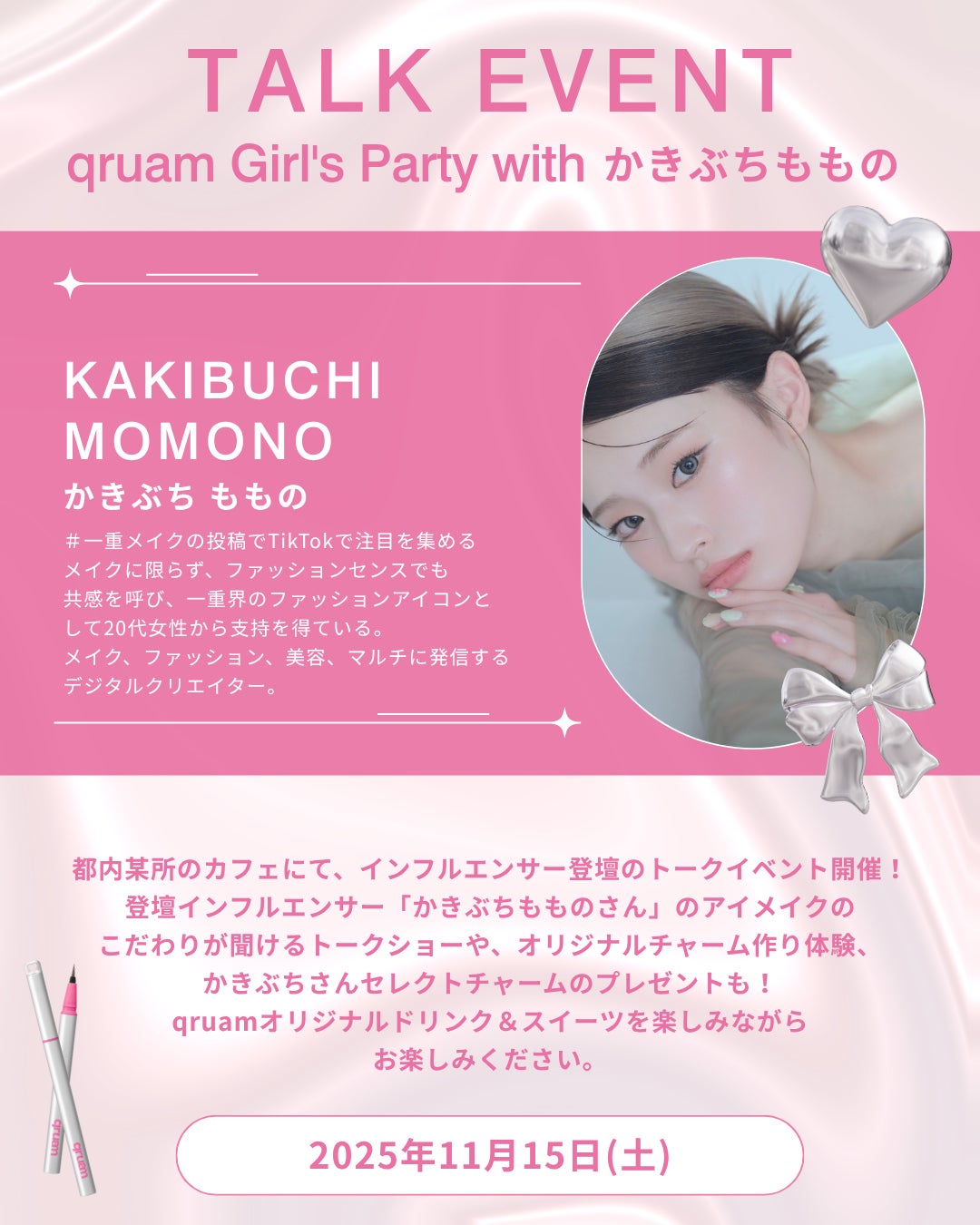 本イベントでは、ゲストのかきぶちももの様のアイメイクのこだわりや、qruamアイチューニングライナーのオススメの使い方についてのトークショーを行います。また実際に商品を試せるだけでなく、かきぶちももの様との撮影会やご本人からのスペシャルプレゼント、アイチューニングライナーに付けられるオリジナルチャーム作り体験など、たくさんのコンテンツもご用意しております。この機会にぜひお気軽にご応募くださいませ。