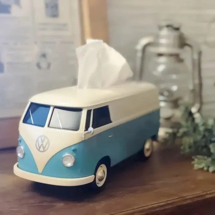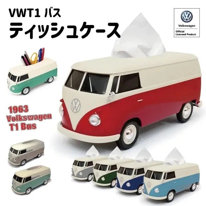 バス型のティッシュケースはVolkswagenのオフィシャルライセンス品で、大きなレトロカーのミニカーのような見た目で袋タイプのティッシュを入れて使うことができるアイテムです。