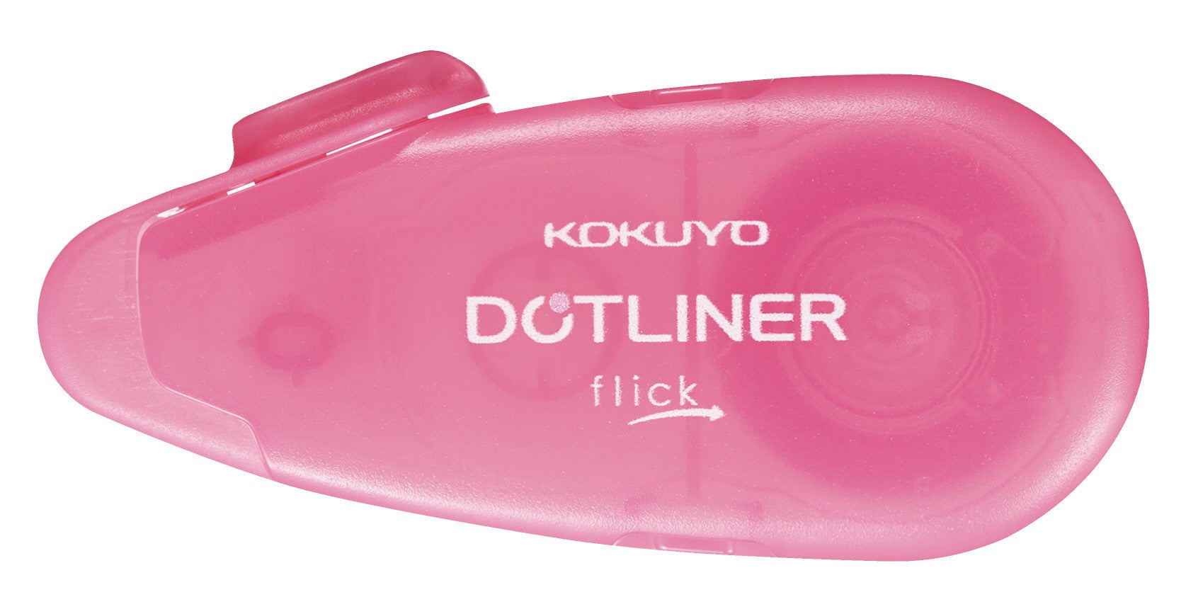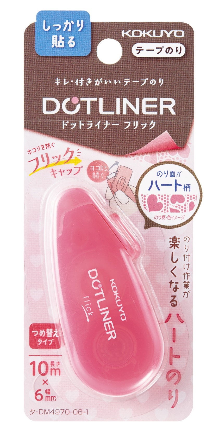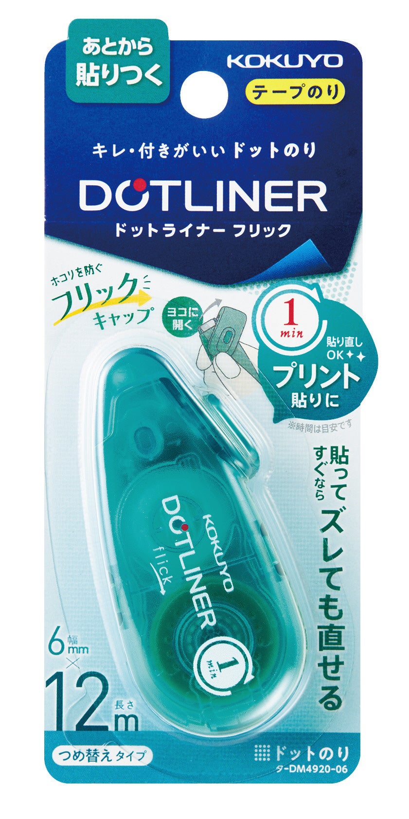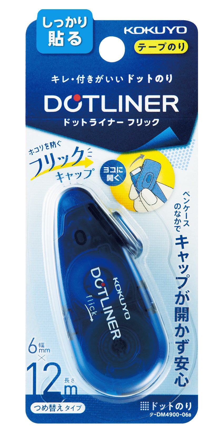 キャップにバネを内蔵した新機構“フリックキャップ”と、つめ替えタイプのテープのりとして、業界最小クラスの本体サイズが特長のドットライナーです。