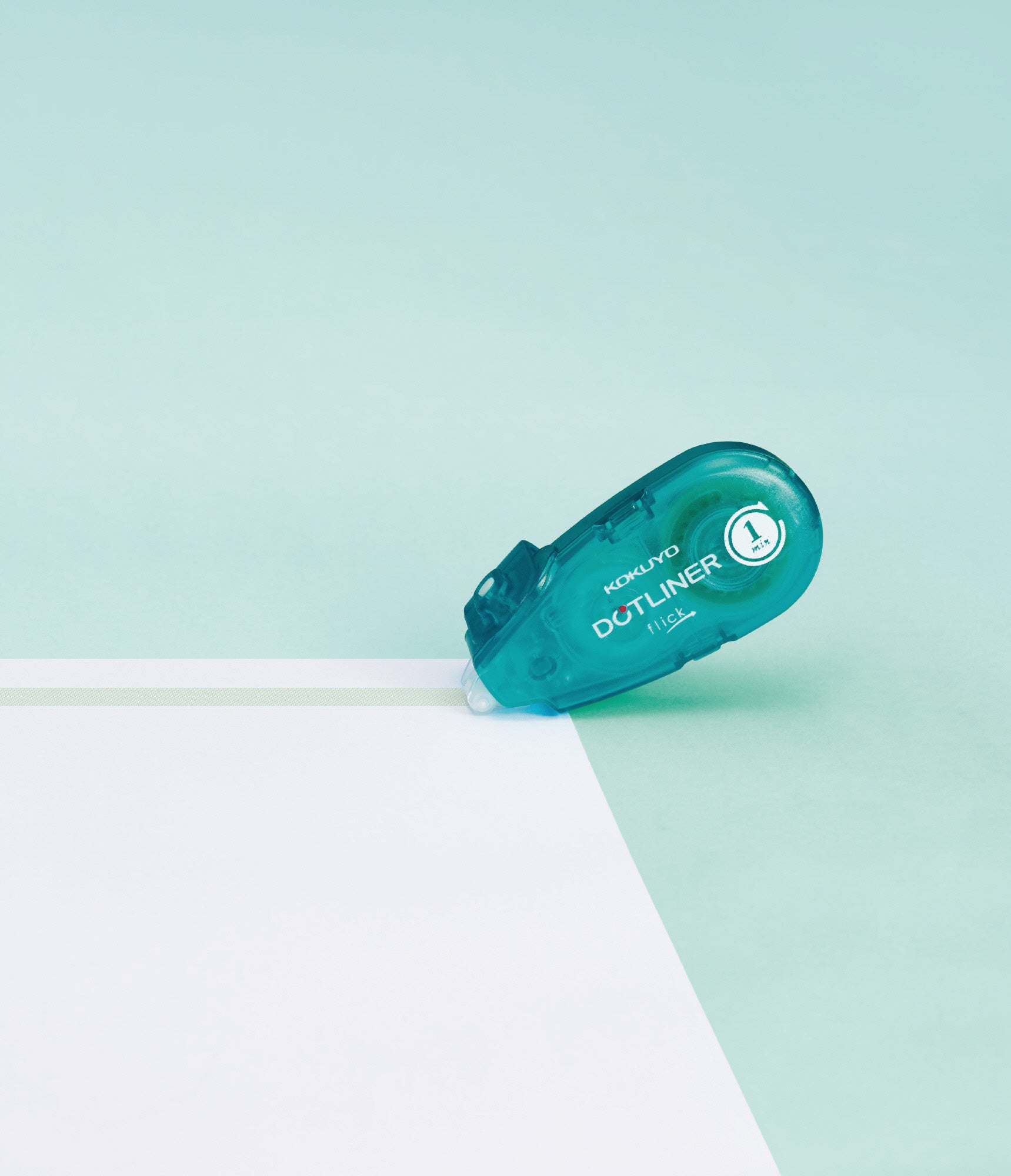 <ドットライナーフリック>は、のりがドット(=点)状に粘着することでのりの切れが良く、手軽にのり付けができるテープのり「ドットライナー」の最新シリーズです。新機構のフリックキャップが、横方向にスライド開閉することで、ペンケースの中で誤って開いてしまうことを防ぎながら、ワンタッチで開けやすいことが特長の、つめ替えタイプで業界最小クラスのコンパクトさを実現したテープのりとなります。