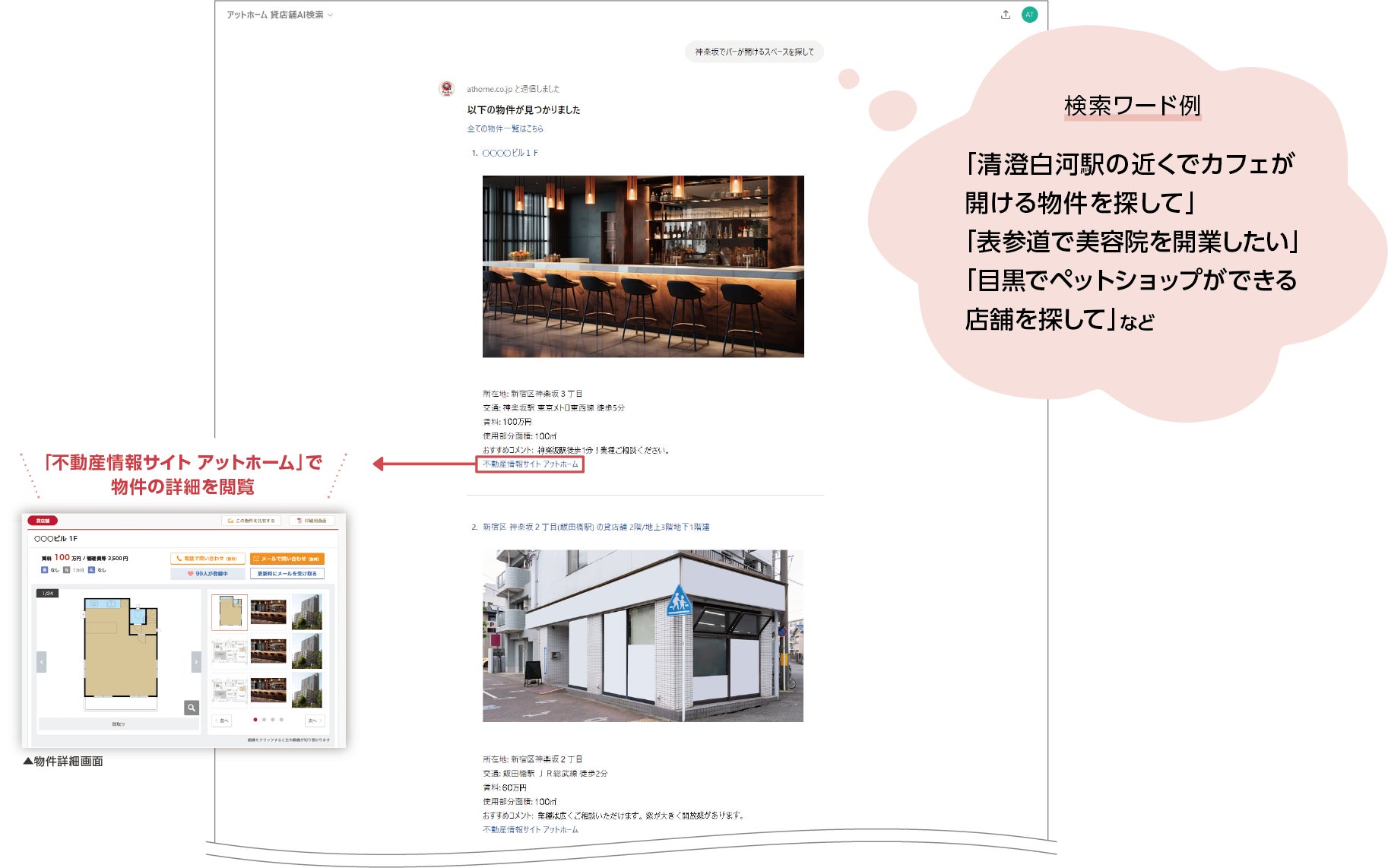 場所や業態、広さなど貸店舗物件に希望する条件のプロンプトを実行すると、ニーズに合った物件情報を検索し、マッチ度の高い物件を5件程度表示します。表示された物件には「不動産情報サイト アットホーム」の物件詳細ページへのリンクがついているため、そこから不動産会社へ問い合わせることが可能です。