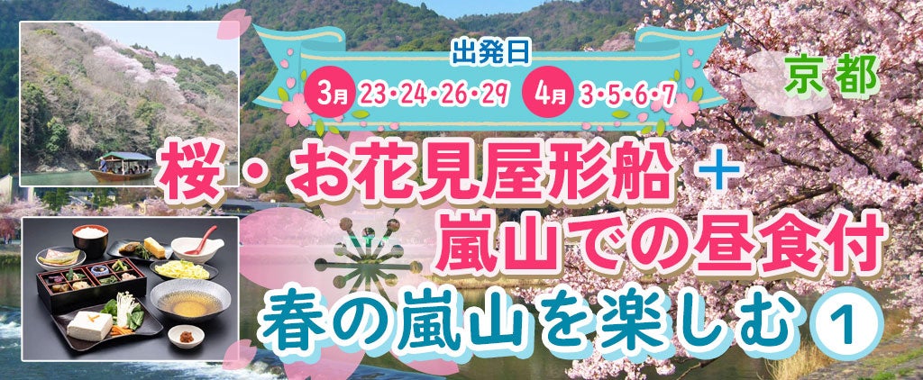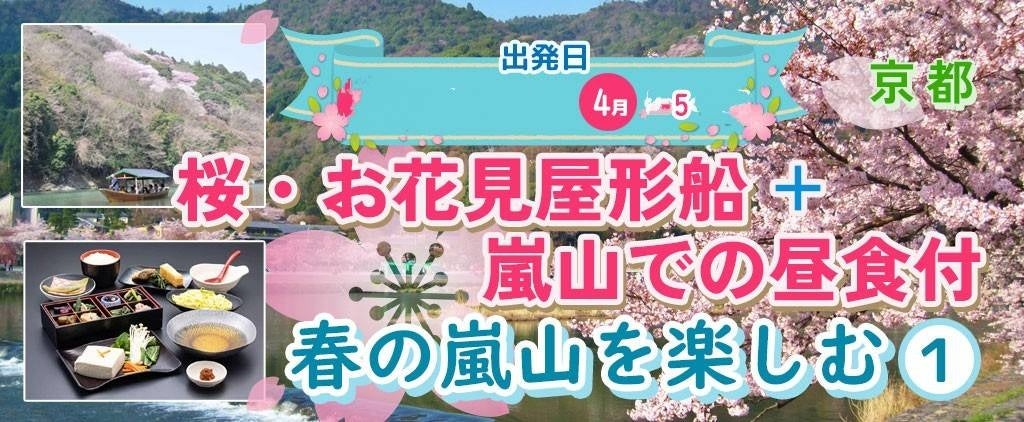 5席増席しました。お一人様¥5,300-~【4/5出発】【京都・嵐山】桜・お花見屋形船+嵐山での昼食付 春の嵐山を楽しむ日帰りプラン