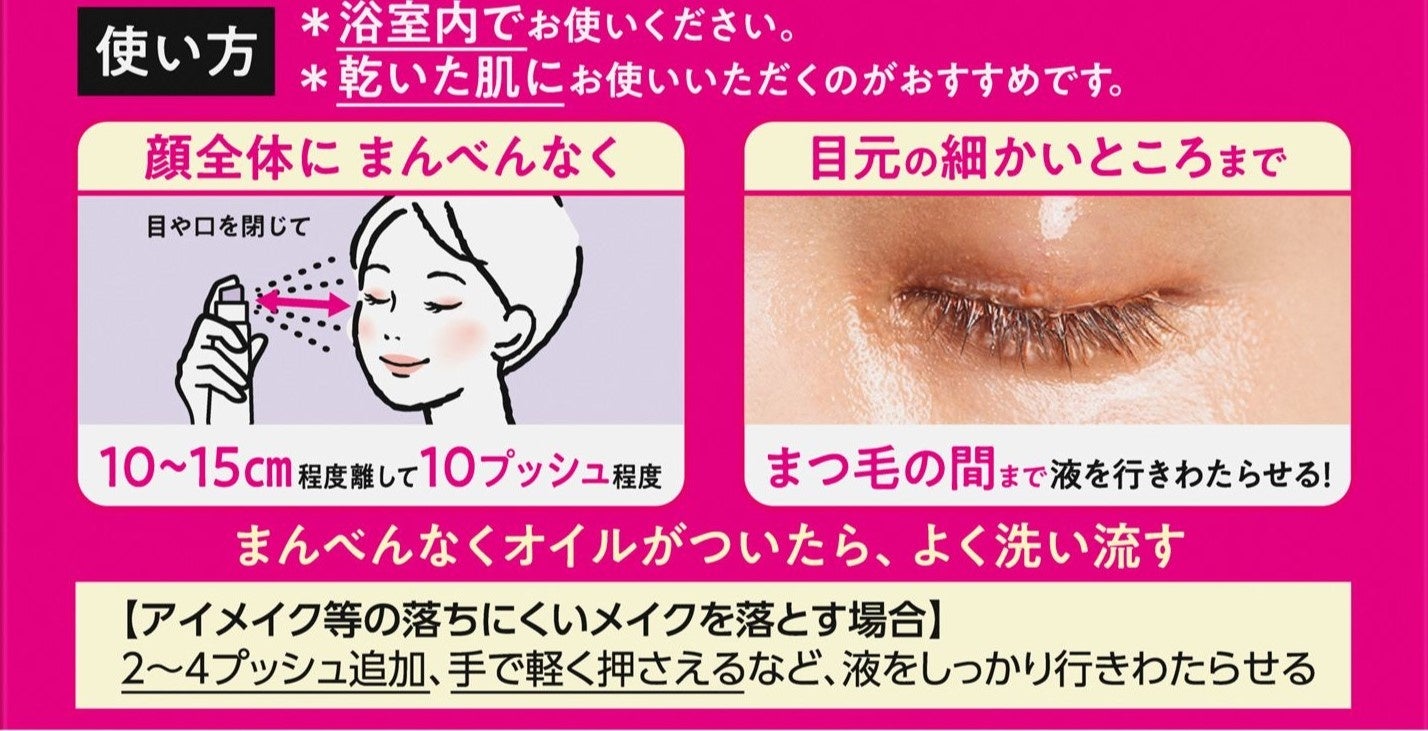 『ビオレ ザ クレンズ オイルミストメイク落とし』は、「メイク瞬浮きブースト技術」を採用。メイクを瞬時に肌から浮かす「メイク瞬浮きオイル」と、新開発のスプレー容器を組み合わせることで、肌当たりの良い微細な粒子状のオイルをシューっと顔に吹きかけるだけで、メイクを浮かし落とすことを実現しました。