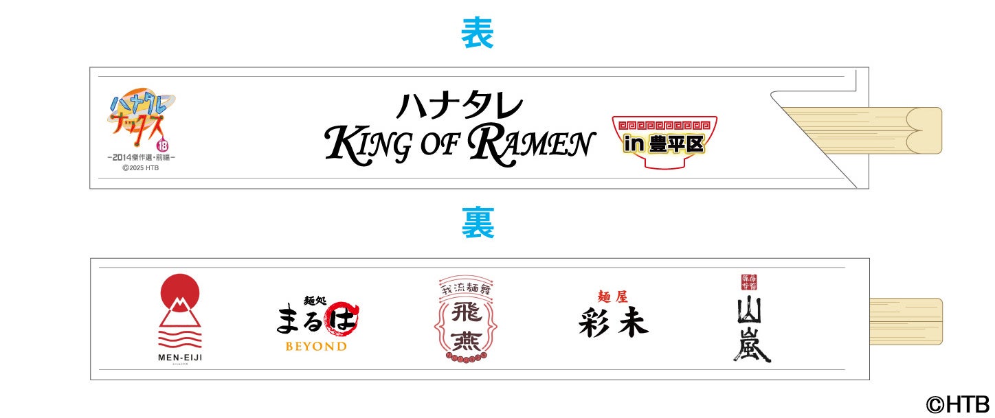 箸袋の表面には番組と「ハナタレ KING OF RAMEN」のロゴ、裏面には豊平区編参加5店舗のロゴをプリントしたオリジナルデザイン!(1膳、竹製)