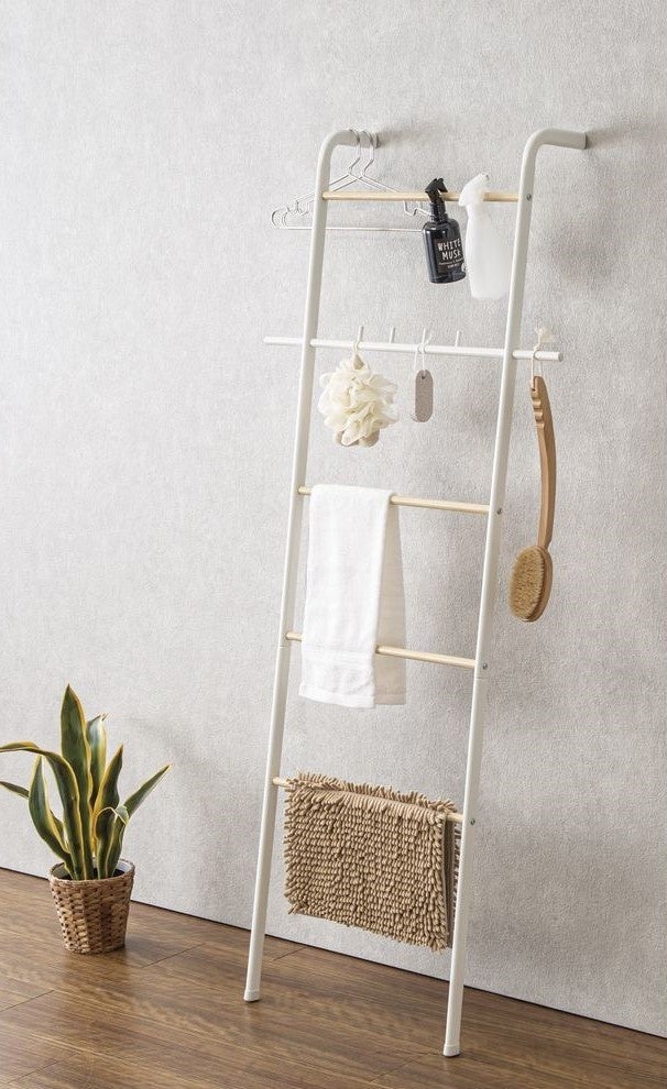 奥行きは約24.5センチのスリム設計で、リビングやバスルームなど、色々な空間で立て掛けてご利用いただけます。スカーフやズボンの一時掛けや、タオルやハンガーを掛けて干したりなど、様々な使い方ができて便利です。