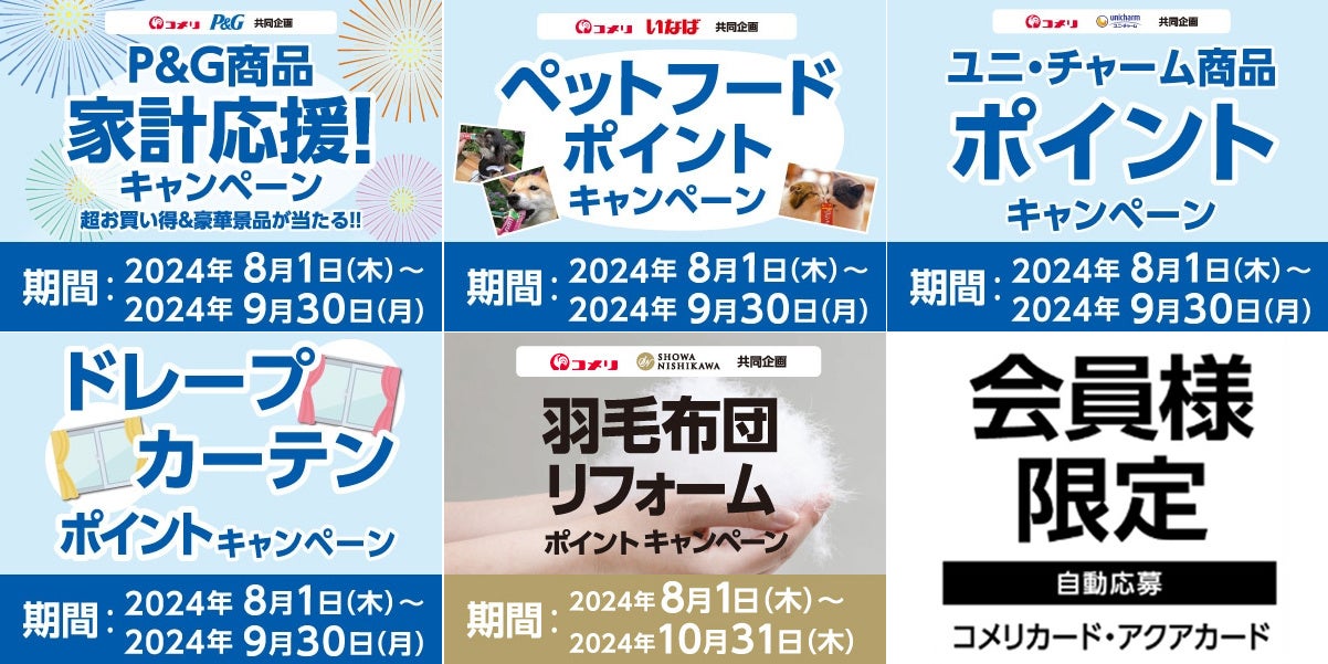 ホームセンターの「コメリパワー」や「コメリハード&グリーン」を通し地域のライフラインとして、地元のプロを応援する株式会社コメリ(所在地:新潟県 新潟市、代表取締役社長:捧 雄一郎)は、コメリの決済手段「コメリカード」「アクアカード」会員様向けに、2024年8月から5種のキャンペーンを新たに開催いたします。