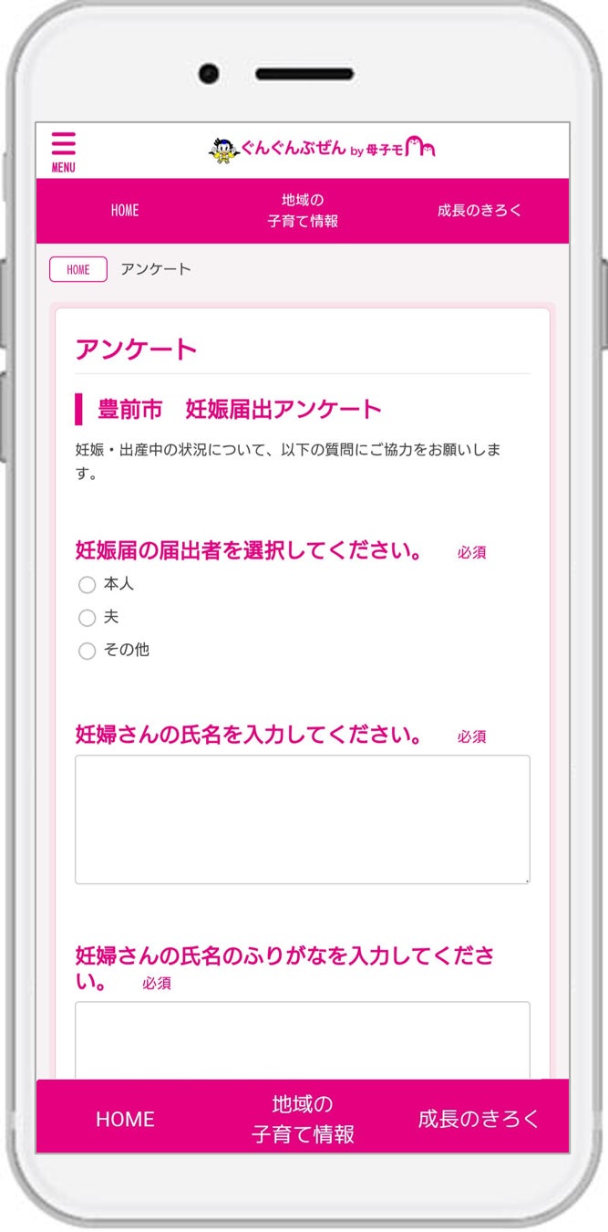 この度、母子手帳アプリ『ぐんぐんぶぜん』追加機能として、妊娠届出や母子手帳交付時アンケート・来庁予約、給付金の申請などを行うことが可能となりました。