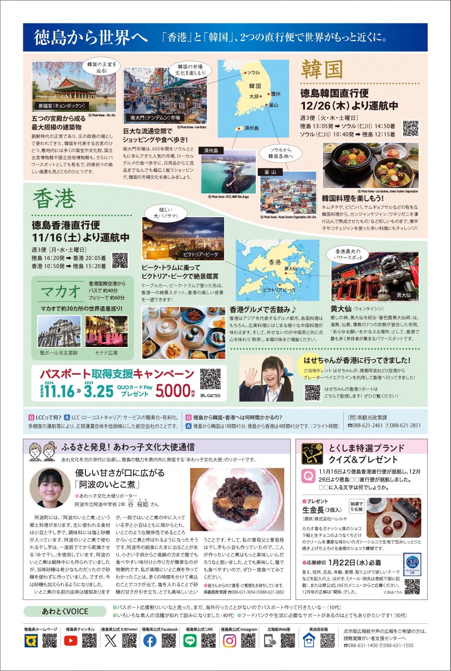 徳島香港直行便が11/16より、徳島韓国直行便が12/26より運航中です。パスポート取得支援キャンペーンも実施中!是非ご利用ください。