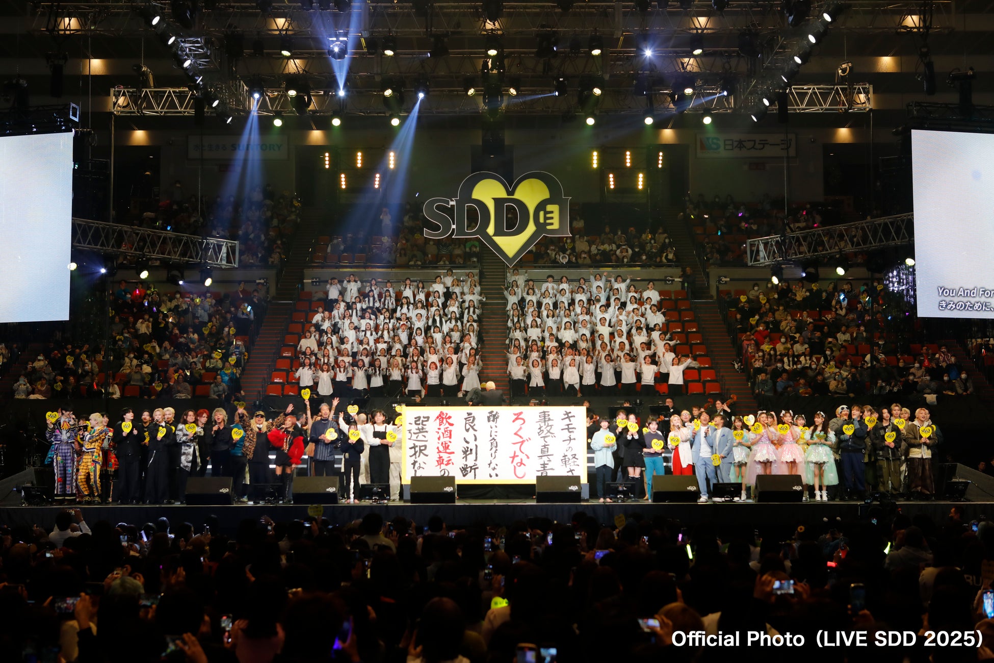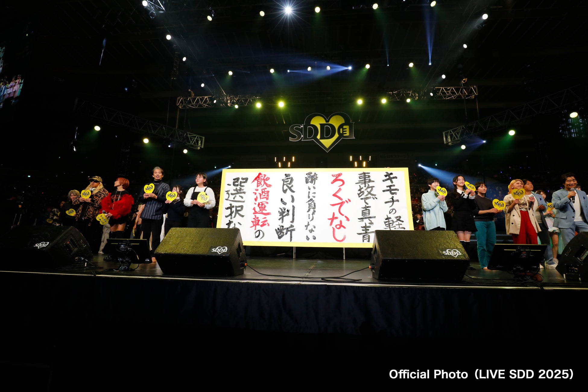 今回で第13回となりました「SDD全国こども書道コンクール」では、約2,000点という多くの応募作品の中から全国5地区それぞれで最優秀賞各1名、優秀賞4名を選出し、表彰しました。2025年2月8日(土)に大阪城ホールで開催された“LIVE SDD 2025”には約11,000人の観客が集まり、そのステージ上で各地区の最優秀賞受賞者5名による受賞作品発表と、グランドパフォーマンスが行われました。グランドパフォーマンスでは、当コンクールのミッションである「こどもたちのために明るい未来を創ること」の実現に向けて、音楽という力強いメッセージと、TRF SAMさんのダンスパフォーマンスとともに、書家の森大衛先生、竹内朱莉先生と子どもたちが思いを込めて力強く書を書き上げました。そのすばらしいパフォーマンスとコラボレーションに対して、大阪城ホールに集まった約1万人の観客の皆さんから大きな拍手が送られ、会場の全員で飲酒運転撲滅を改めて強く誓い合いました。