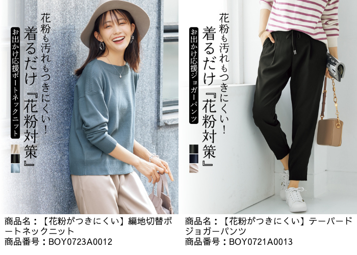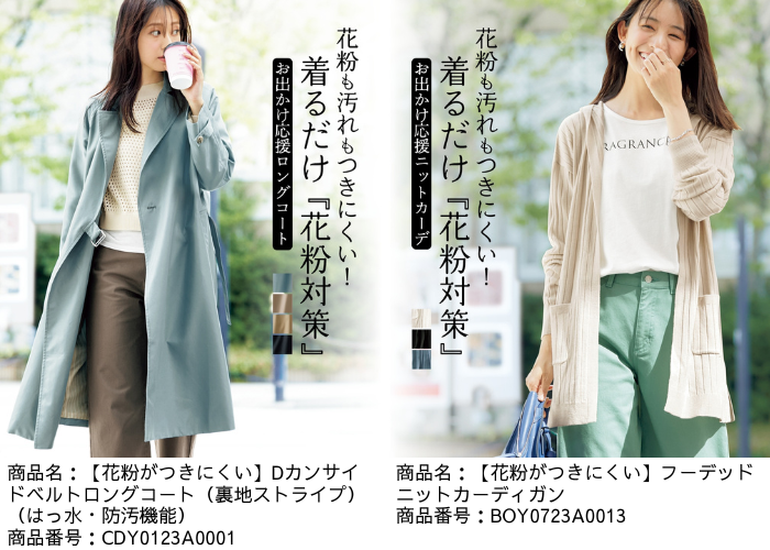 「nissen,」カタログ掲載商品の中からご紹介するのは、「花粉の悩みから解放されたい」というお客様の声にお応えして、花粉も汚れもつきにくい加工で、春のお出かけを応援する商品です。ナノはっ水素材を使用し、花粉がつきにくく、ついても軽く払うだけで落としやすいのが特徴。