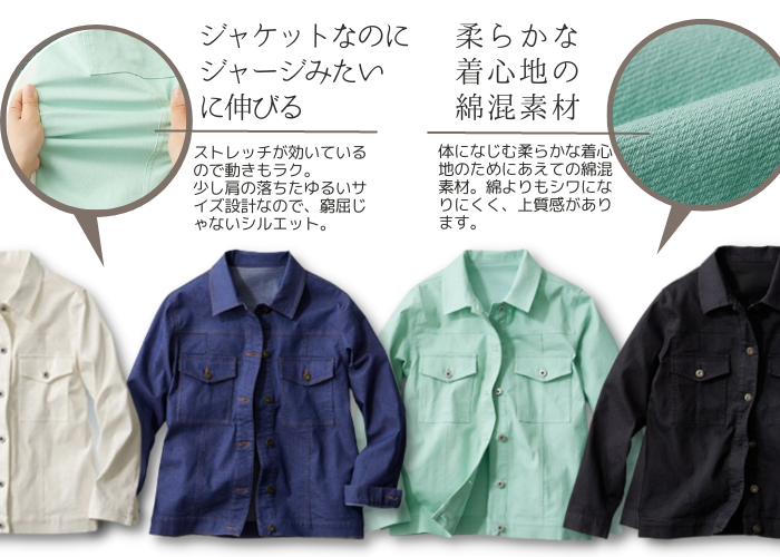 ストレッチが効いている素材だから、背中も腕まわりも伸びてラク!少し肩の落ちたゆるいサイズ設計やシルエットの工夫で、窮屈感がない、どんな動きにもついてくるジャケットです。