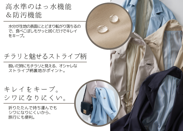 商品名:【花粉がつきにくい】トレンチコート(裏地ストライプ・共布ベルト付)(はっ水・防汚機能)