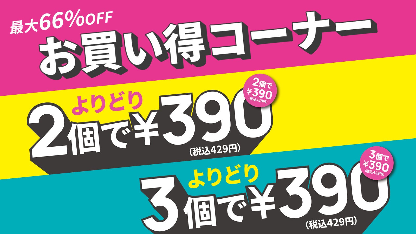 1月25日(水)より「2個390円」「3個390円」のお買い得コーナーを新設!人気アイテムを最大66%OFFのサンキュープライスで提供