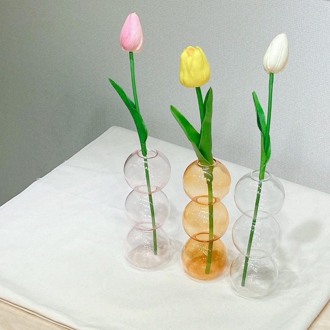 ドライフラワーやお花の一輪挿しをお水に入れて飾っても可愛い、韓国インテリアで人気のフラワーベースが3点税抜390円(税込429円)になって登場します。ピンク・オレンジ・クリアの3色展開で、3色並べて使ってもオシャレなアイテムです。