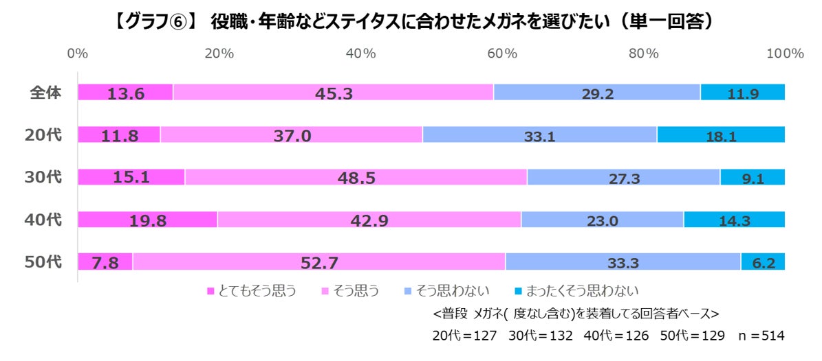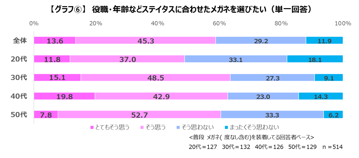 「役職・年齢などステイタスに合わせたメガネを選びたい」と考えるのは全体で58.9%。半数以上が自身の役職や年齢に合うものを選びたいと考えています。その意識が最も高いのは30代で、「とてもそう思う+そう思う」で63.%という結果でした。【グラフ⑥】