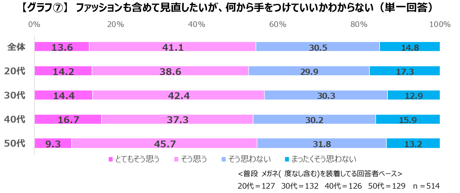 「ファッションも含めて見直したいが、何から手をつけていいかわからない」という悩みを持つのは、全体で54.7%と半数以上でした。特に30代で高く、「とてもそう思う+そう思う」で56.8%と他の年代よりも高い傾向が見られます。【グラフ⑦】