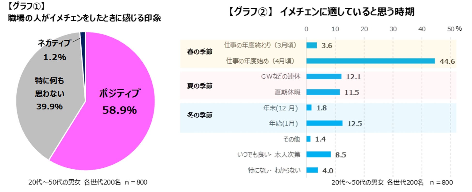 イメチェンをすることで毎日顔を合わせる職場の人にどのように思われるか不安もありますが、ポジティブなイメージが高く、社会人として新たな年度を迎える春のタイミングは、心機一転イメチェンをして気分も新たに前向きになれるタイミングと思っている人が多いことが分かります。
