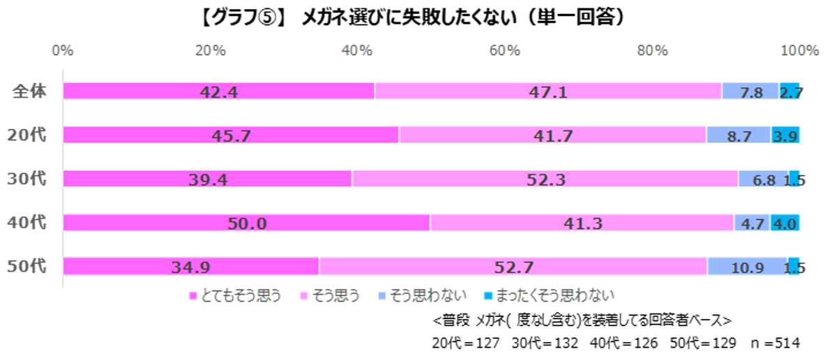 「メガネ選びに失敗したくない」という考えでは全体で89.5%(失敗したくないと思う:とてもそう思う+そう思う)と非常に高く、「とてもそう思う」では20代が高いものの、「失敗したくないと思う」では30代で9割以上が失敗したくないと回答しています。【グラフ⑤】