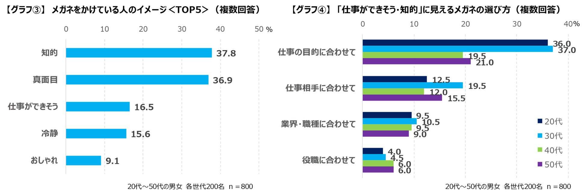 ビジネスシーンにおいて、仕事の目的や相手にあわせてメガネを選ぶ人を「仕事ができそう・知的」と捉える人は30代で多く、40代以上とのギャップが見られる結果となりました。