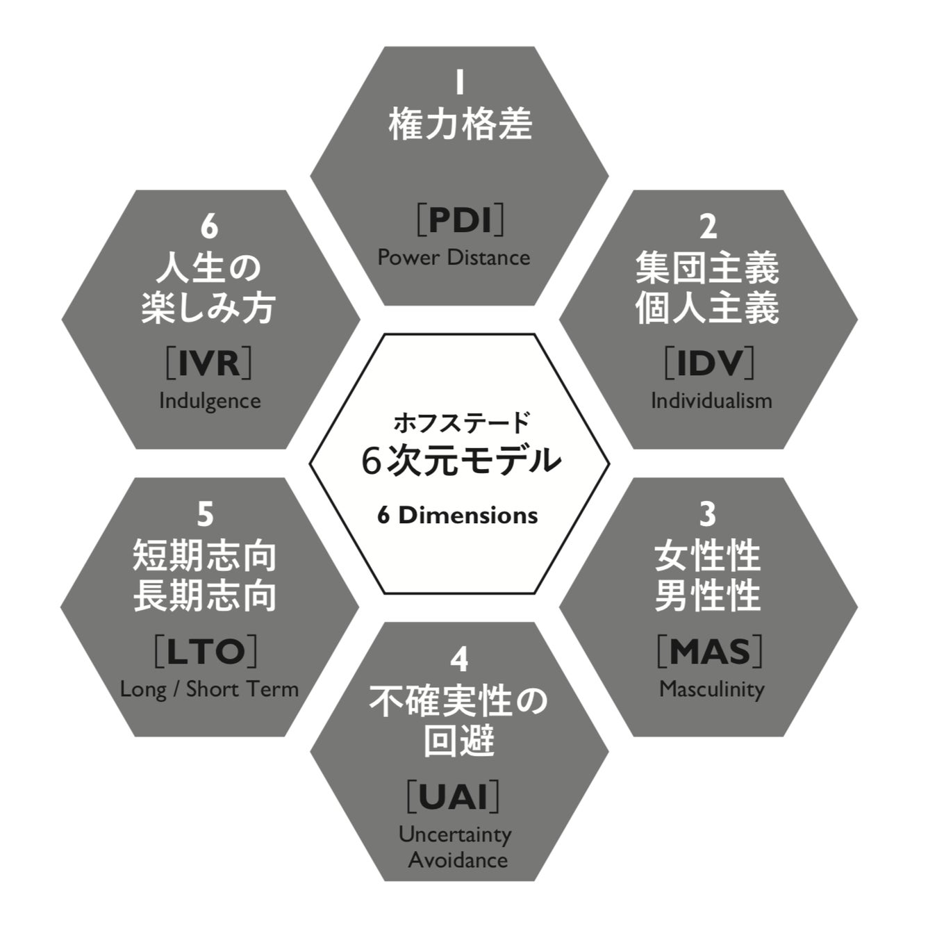 国レベルの文化的価値観がどのように異なるかを「権力格差」「集団主義/個人主義」「女性性/男性性」「不確実性の回避」「短期志向/長期志向」「人生の楽しみ方」の6つの次元で表す。