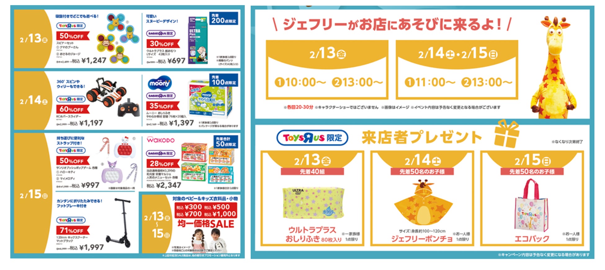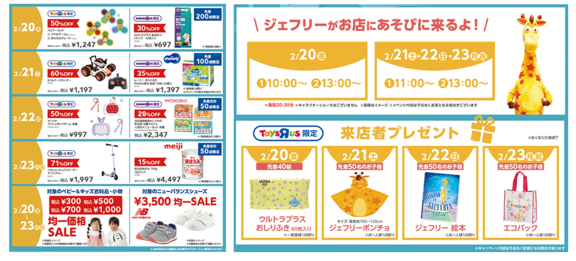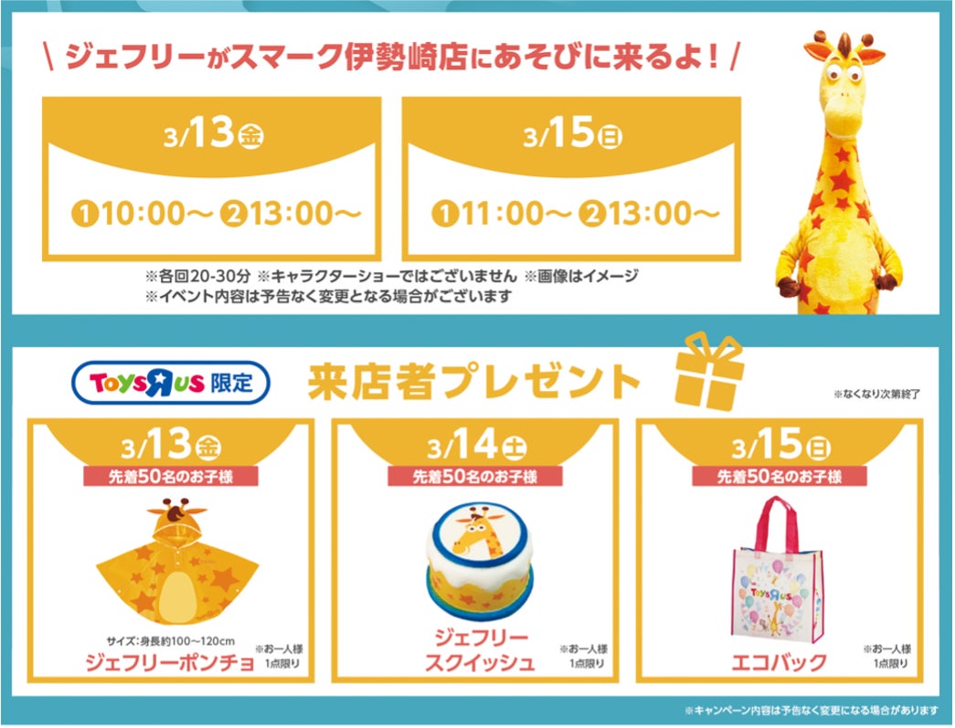 このたびの移転&新店オープンを記念して、トイザらスオリジナルのおもちゃ・ノベルティグッズのプレゼントや公式キャラクター「キリンのジェフリー」のグリーティング、おもちゃやベビー用品のスペシャルセールなど、子どもたちおよびご家族のみなさまにお楽しみいただけるプレゼントやイベントをご用意いたします。(※)詳細については下記の当社ウェブサイトをご覧ください。