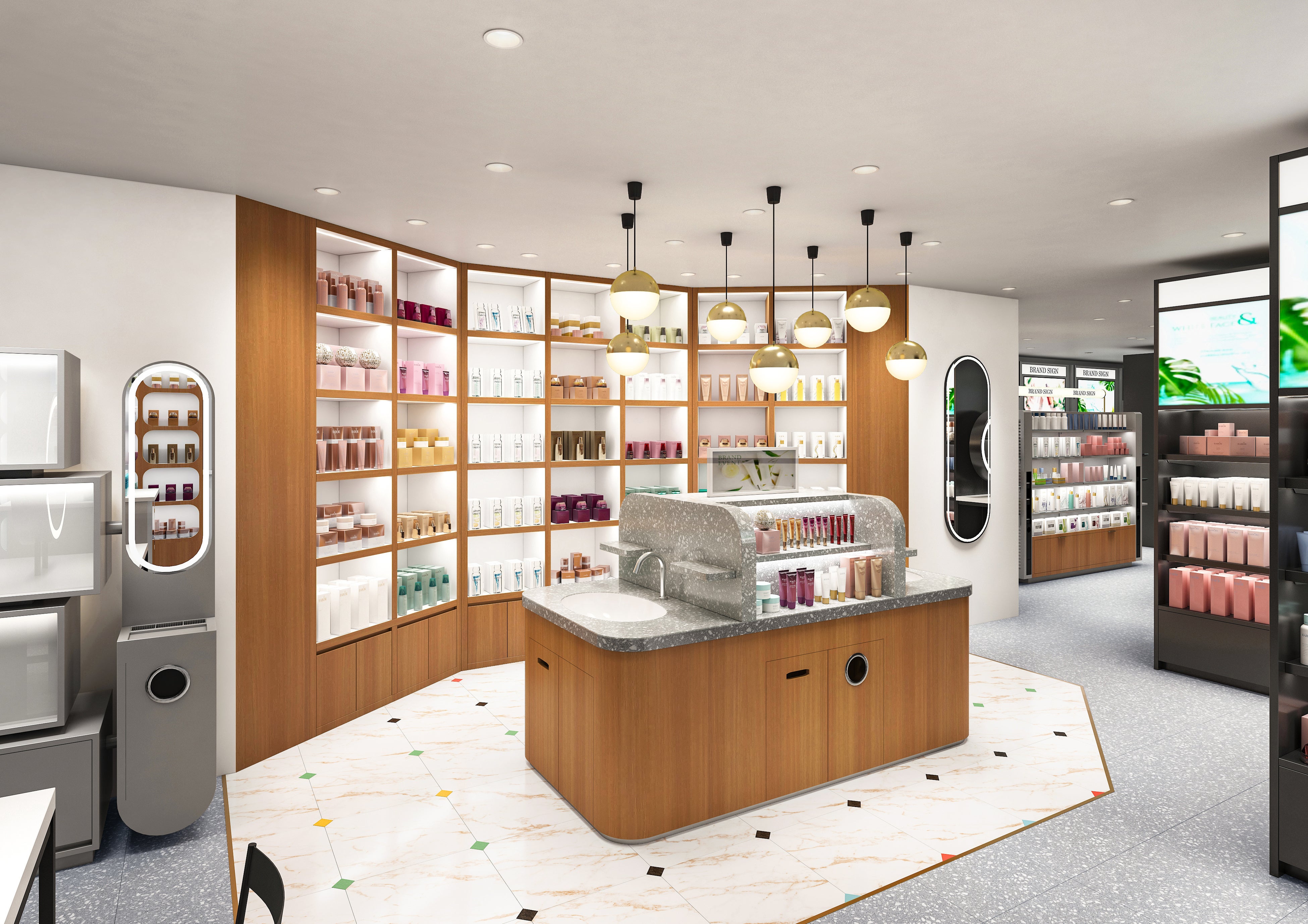 内装は従来の@cosme STOREの意匠にレトロモダンなデザインを加え、高揚感と心地よさを両立させた空間に仕上げました。また、電子整理券システム「AirWAIT」を導入することで、「誰に声をかければいいかわからない」「美容部員に声をかけるのに、心理的なハードルを感じる」といった不安なく、「シドニー」でお客様の支持をいただいてきたカウンセリングやタッチアップを、どなたでも気軽にリクエストいただけるようになります。さらに、混雑時でも待ち時間の予測ができるため、ストレスなくお過ごしいただけます。