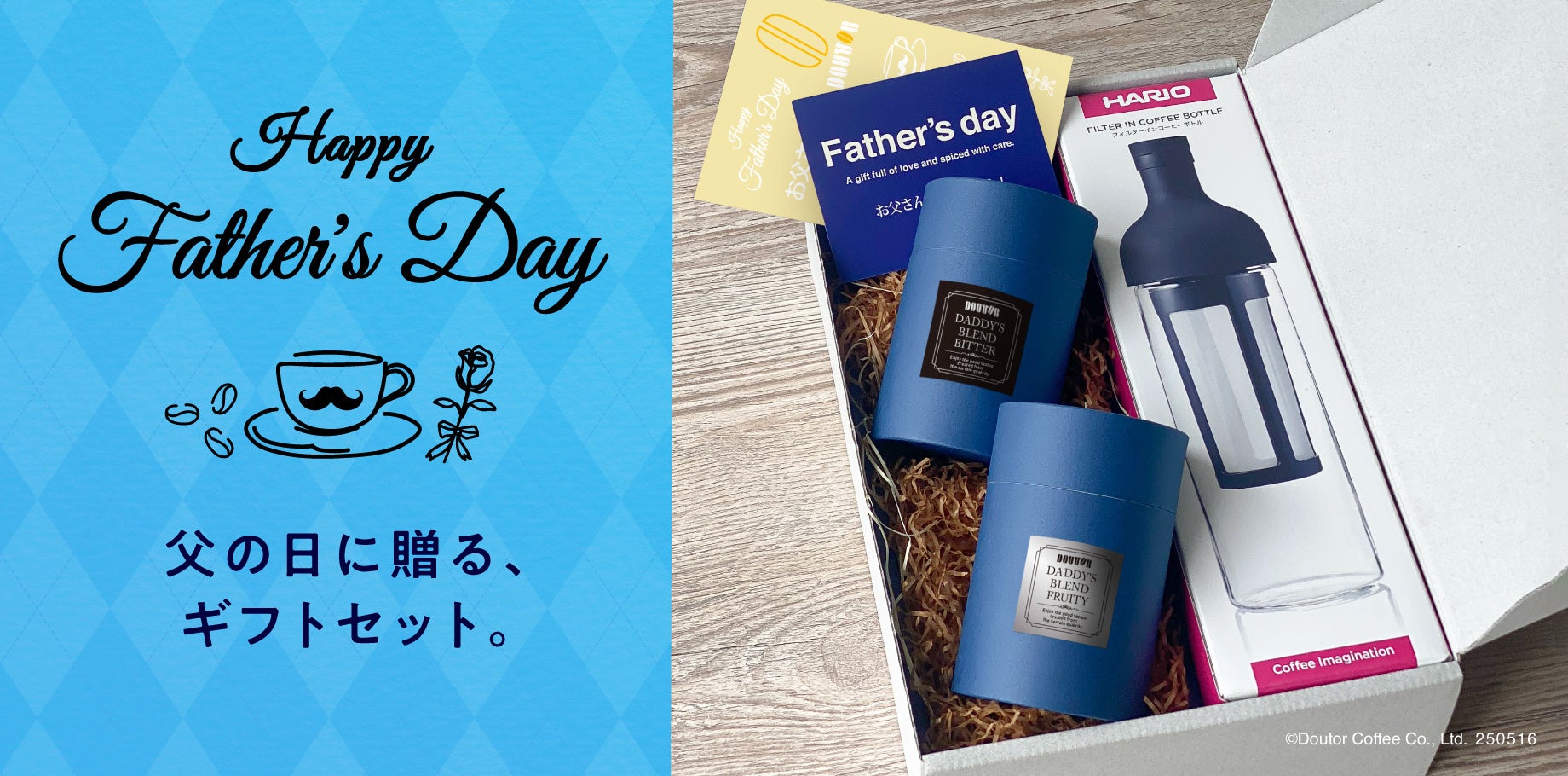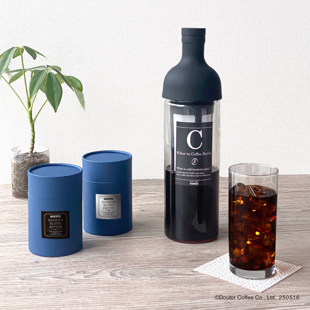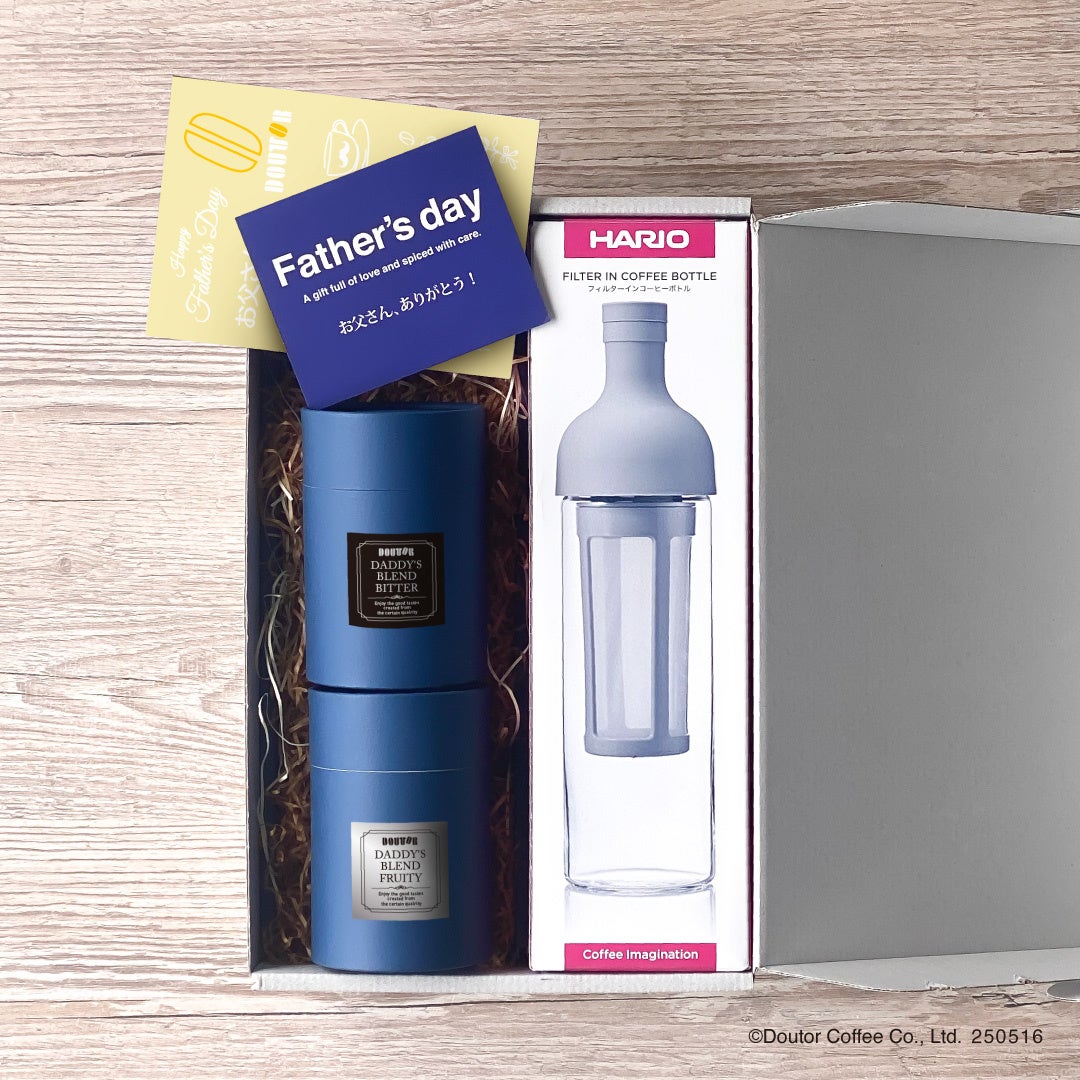 すっきりとクリアで飲みやすい「ダディーズブレンド ビター」と、フルーティーで香ばしい「ダディーズブレンド フルーティ」を、手軽に楽しめる「HARIOフィルターインコーヒーボトル」とセットにした、ドトール オンラインショップ限定ギフトです。気持ちを伝える父の日メッセージカードと、ボトル本体や持ち物などをお好みでデコレーションできるオリジナルステッカー付き。シンプルなアイスコーヒーボトルを、お父さん仕様にして楽しんでいただけます。