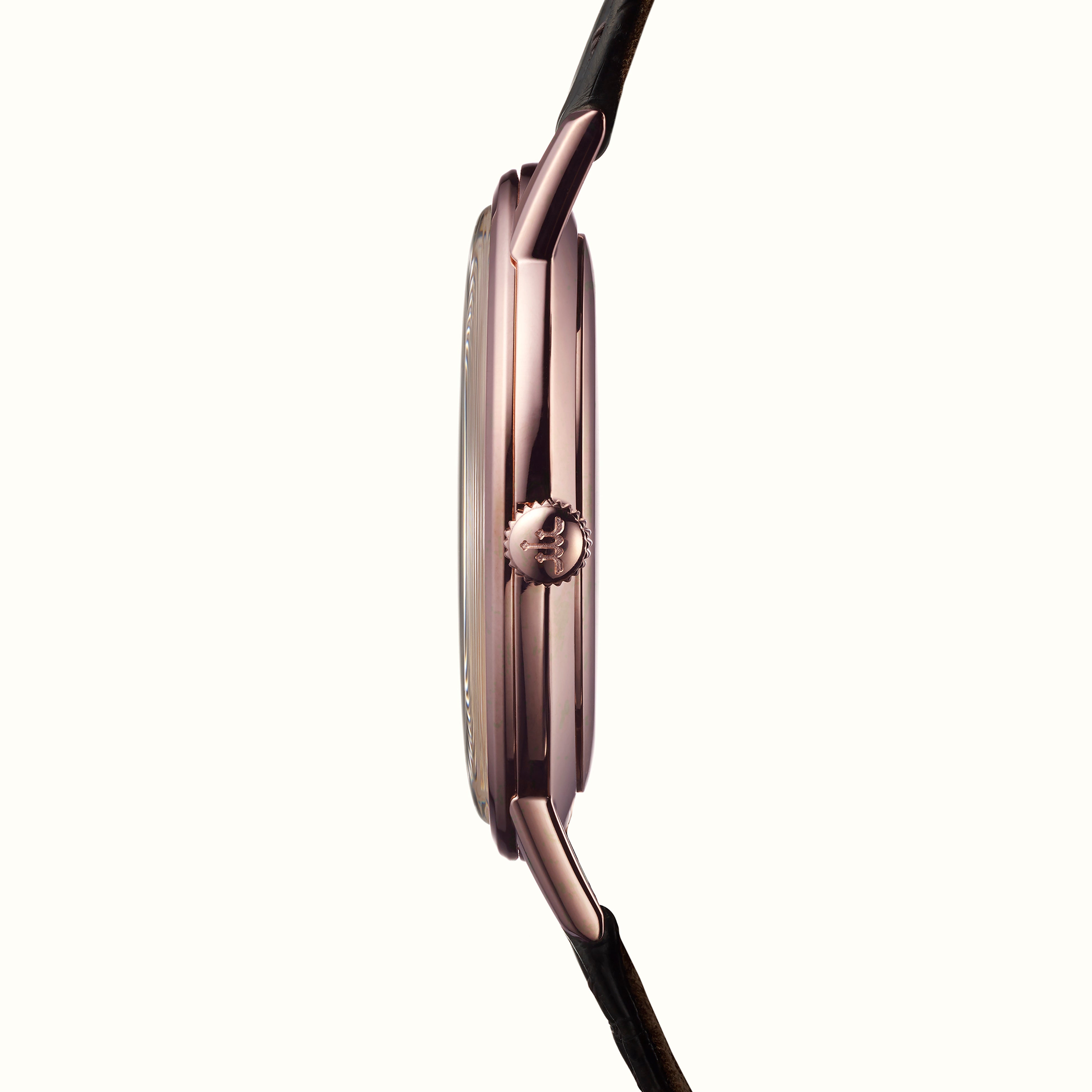 レギュラーモデル(18Kピンクゴールドモデル)は、ダイヤルに沿って曲げた極細のインデックスを採用し、視認性を一層向上させています。