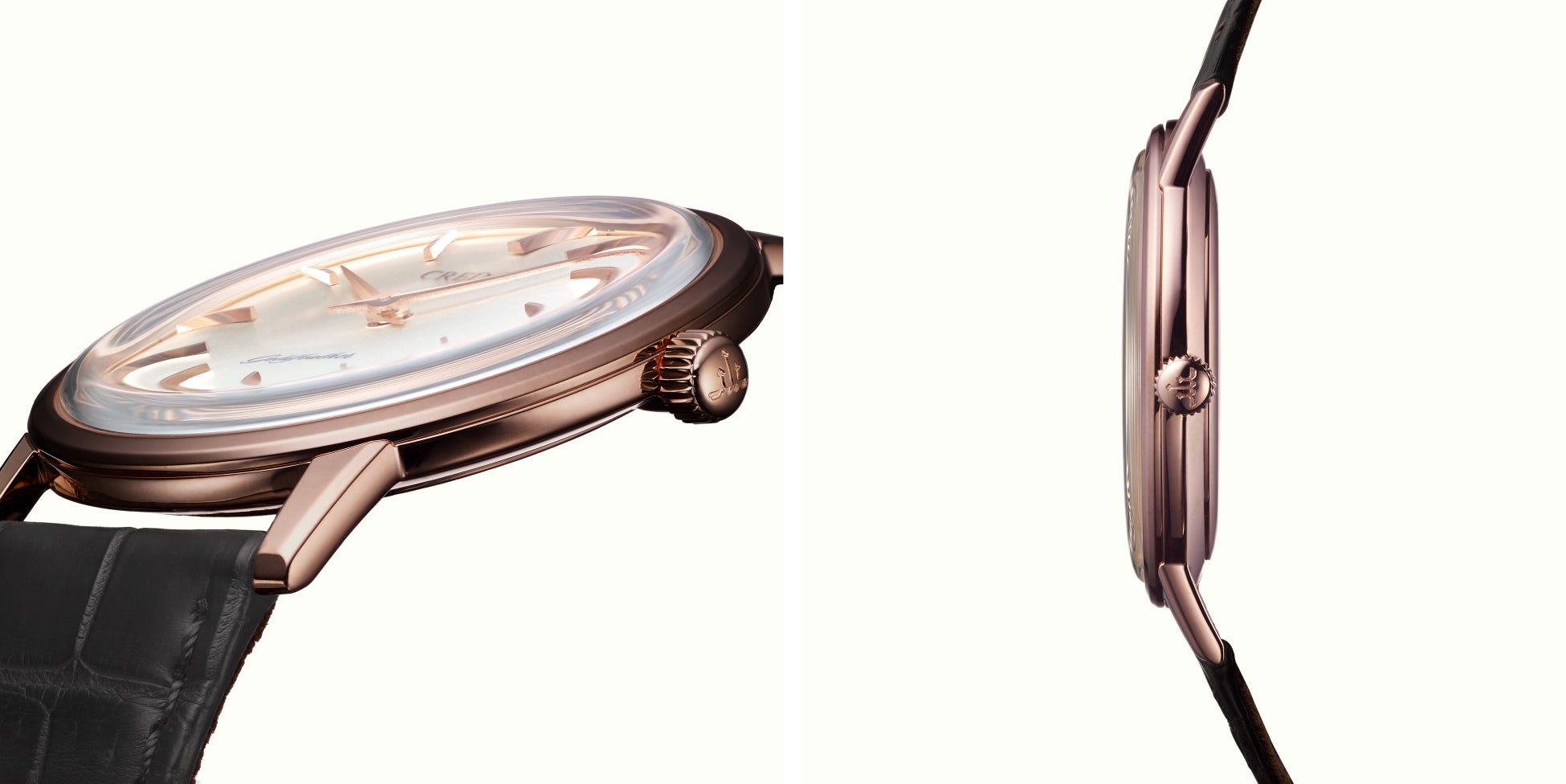 本作のケースは5つのデザインコンセプトに基づき、丸みを帯びた優美でおおらかな造形と、袖口に収まりやすい薄さの両立を図っています。さらに、ムーブメントをケースに直接固定し、裏ぶたのサイズを最小化する新構造を採用したことで、ケース裏側の斜面が広くなり、腕に着けた際、実際の厚さよりも薄く見えるデザインに仕上げています。また、細く軽やかなかん足とベゼルには、熟練の職人によって、それぞれザラツ研磨とダイヤカットが施され、繊細なシルエットを際立たせるように煌めきます。