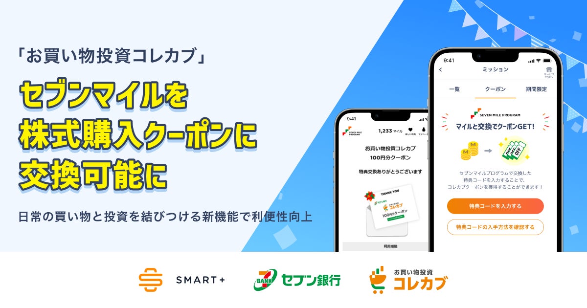 次世代金融インフラの提供を通して組込型金融を実現するFinatextグループの株式会社スマートプラス(本社:東京都千代田区、代表取締役:小林 紀子、以下「当社」)は、株式会社セブン銀行(以下「セブン銀行」)と協業して運営する「お買い物投資コレカブ」において、お客さまの利便性を一層向上させるため、株式会社セブン&アイ・ホールディングス(以下「セブン&アイ」)が提供する「セブンマイルプログラム」から株式購入時に利用できる割引クーポンへの交換を開始したことをお知らせいたします。