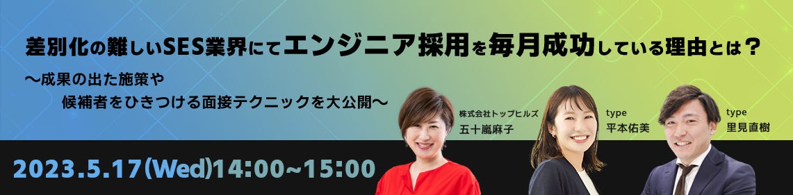 転職サイト「type」では、5/17(水)14時より人事担当者様向けのオンラインセミナー「差別化の難しいSES業界にてエンジニア採用を毎月成功している理由とは?~成果の出た施策や候補者をひきつける面接テクニックを大公開~」を開催いたします。