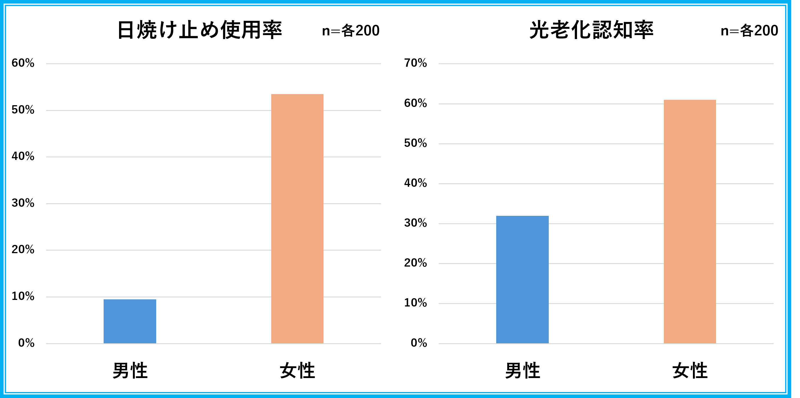 そこで日焼け止めの使用率を調査すると、日焼け止めを使用している男性は10%と、女性の約1/5の割合という非常に少ない結果になりました。また、UVケアを行うべき理由の一つとして、光老化の予防が挙げられます。光老化の認知度について調査を行ったところ「知っている」と答えたのは男性32%、女性61%という結果となり、男性のUV対策商品の使用率はUVケア全般に対する情報量が影響していることが推測されます。