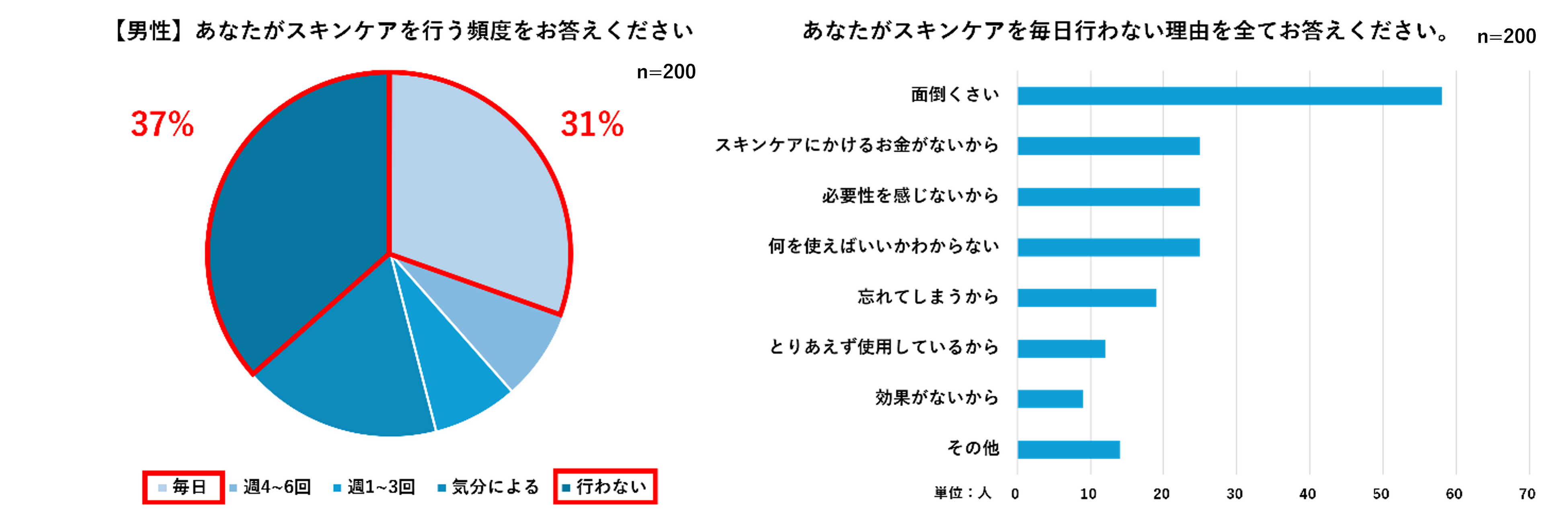 ①男性のスキンケア頻度は「行わない」が37%、「毎日行う」が31%と2極化している